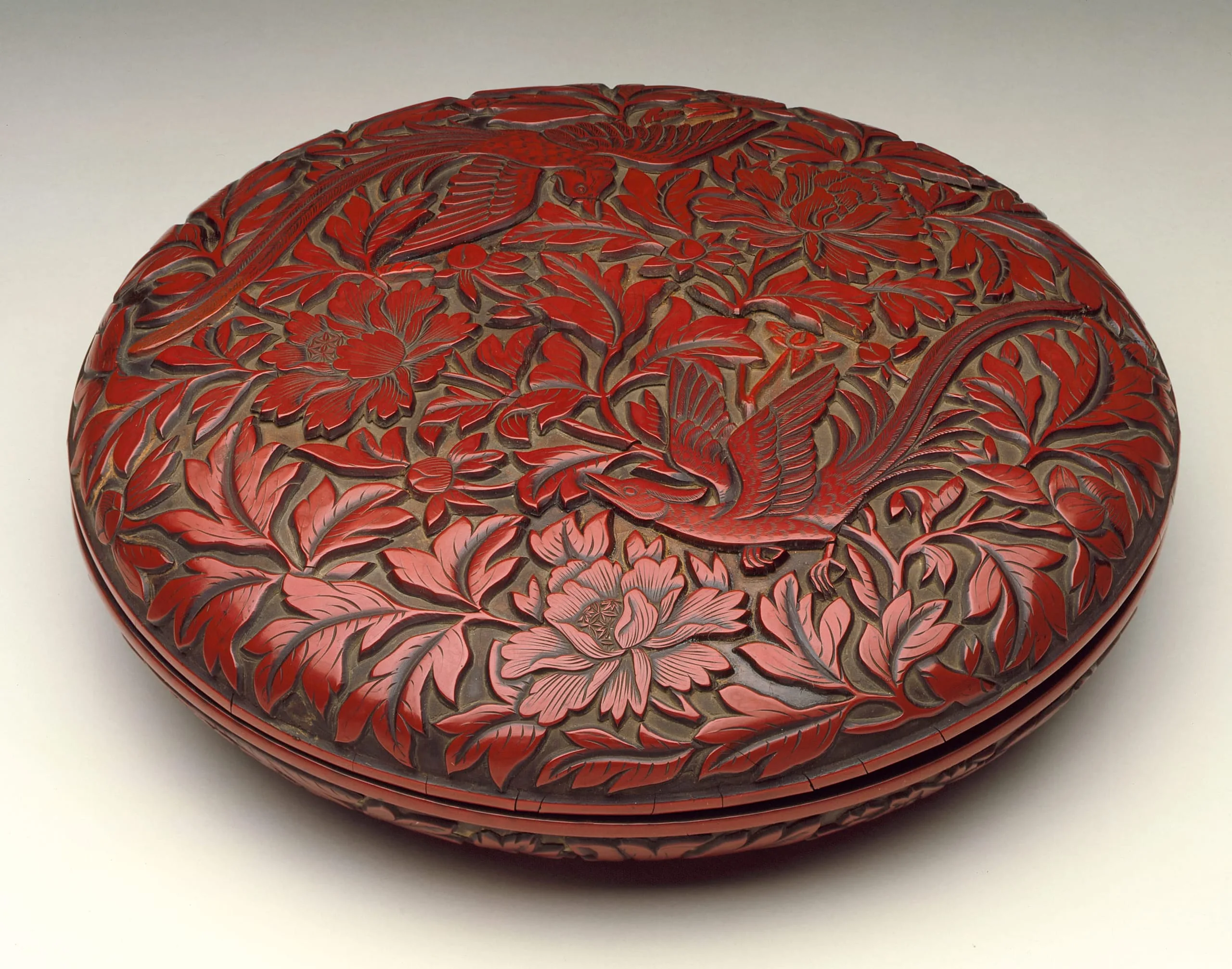 - Carved red lacquer on wood core