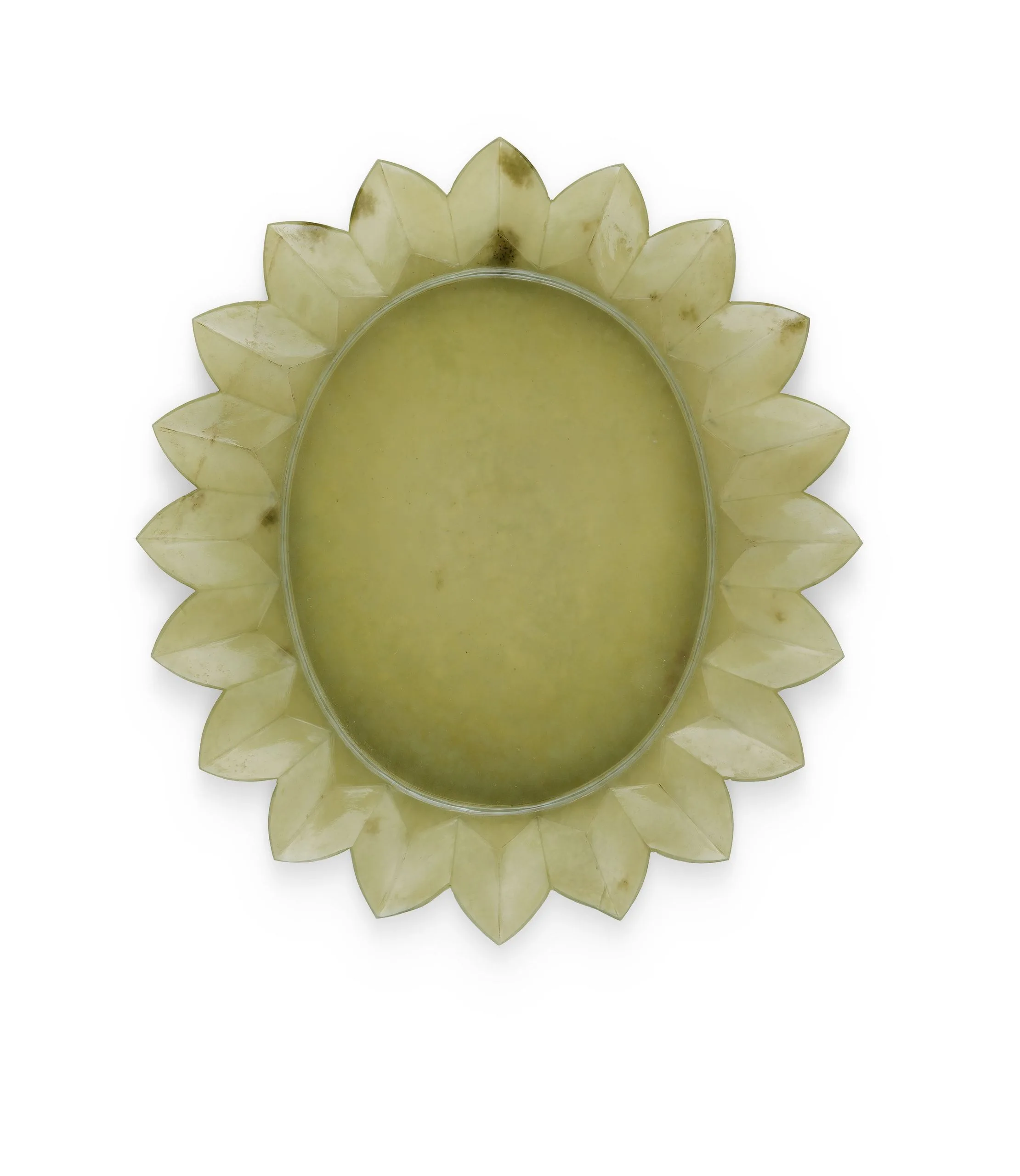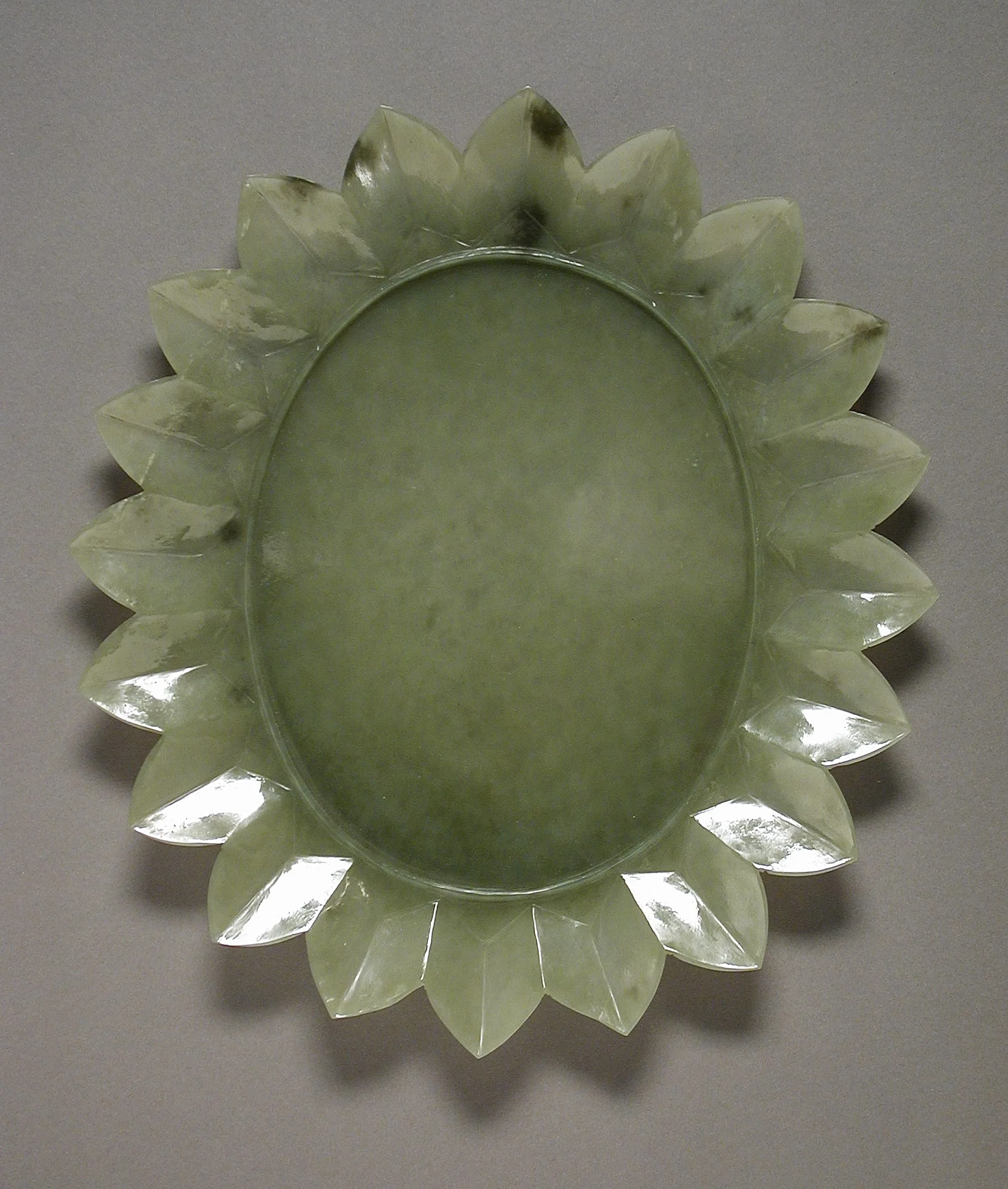 Deftly fashioned out of light green nephrite jade, this shallow plate for serving delicacies has an unadorned flat ovular center demarcated by a raised ring. The sophisticated outer border rises from horizontal triangular interstices to an accordion-fold pleated edge of pointed lotus petals.