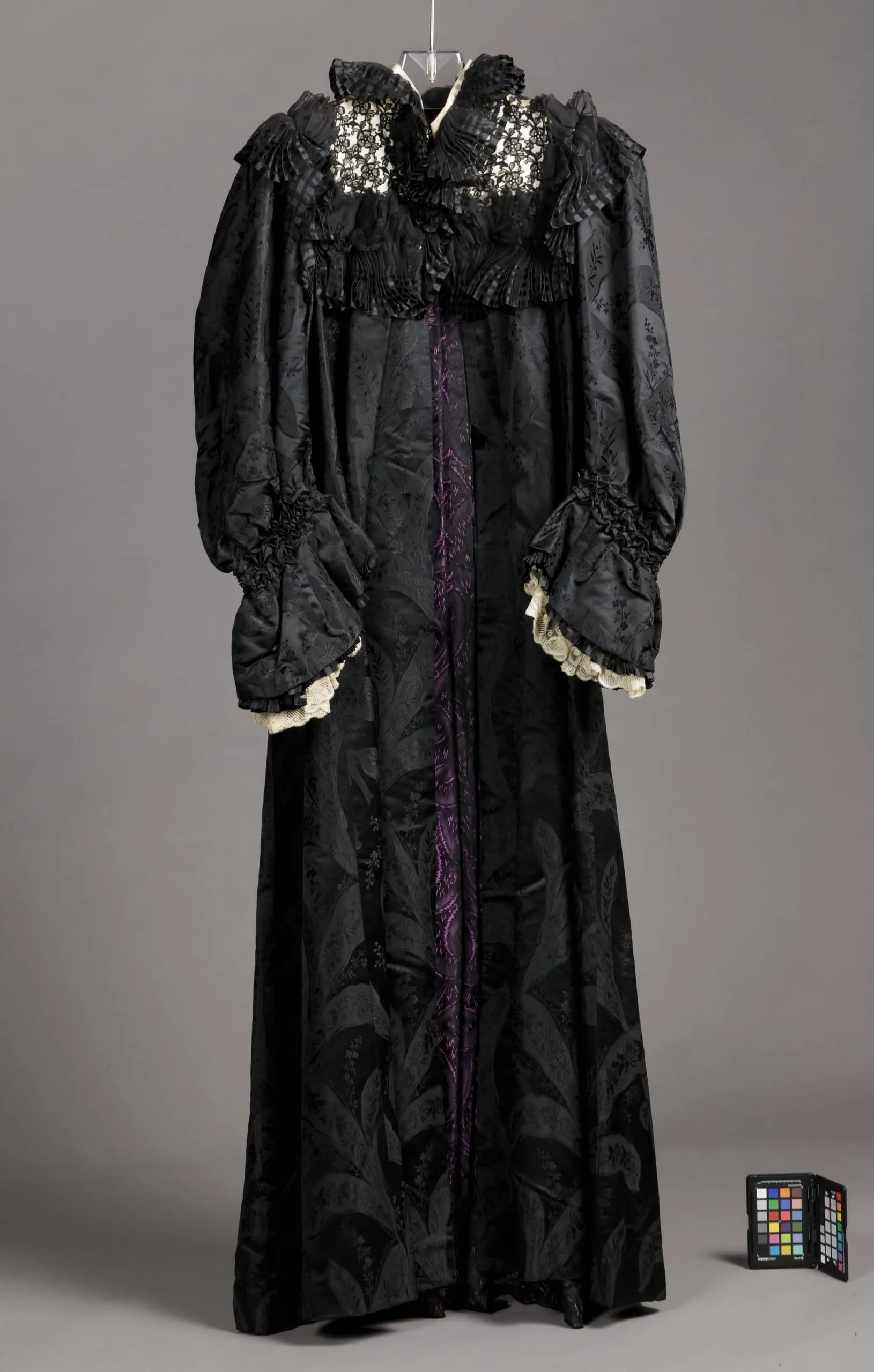 - Silk plain weave (faille), with supplementary weft floats bound in plain weave (compound weave), silk plain weave (faille) with supplementary wefts bound in twill (compound weave), silk plain weave with supplementary warp float patterning (organza), linen lace, silk satin, and silk appliqués