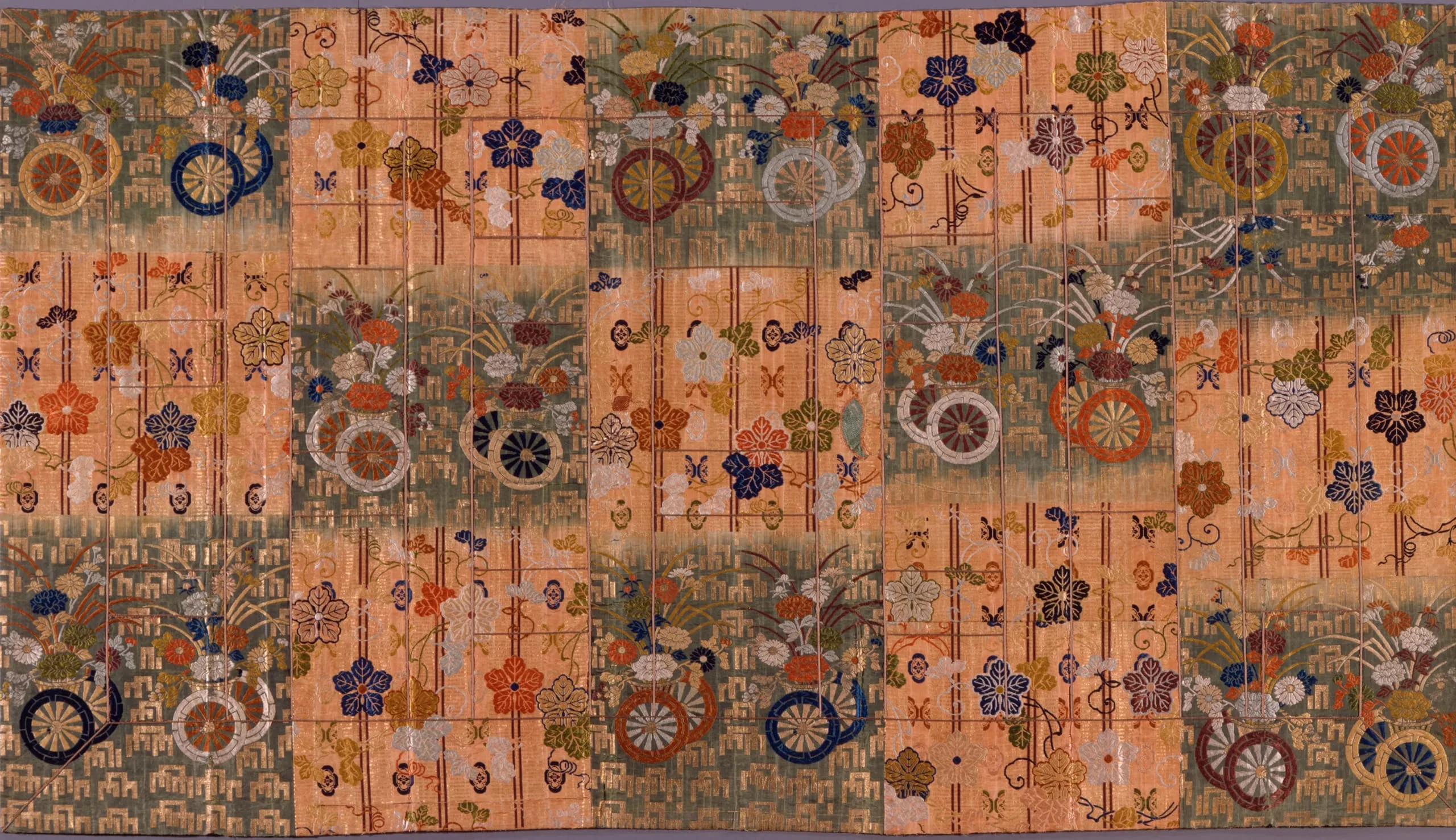 - Silk twill, tie-resist ikat dyed (kasuri) warp, with silk and gilt-paper suppementary weft patterning (karaori), with silk braided cord
