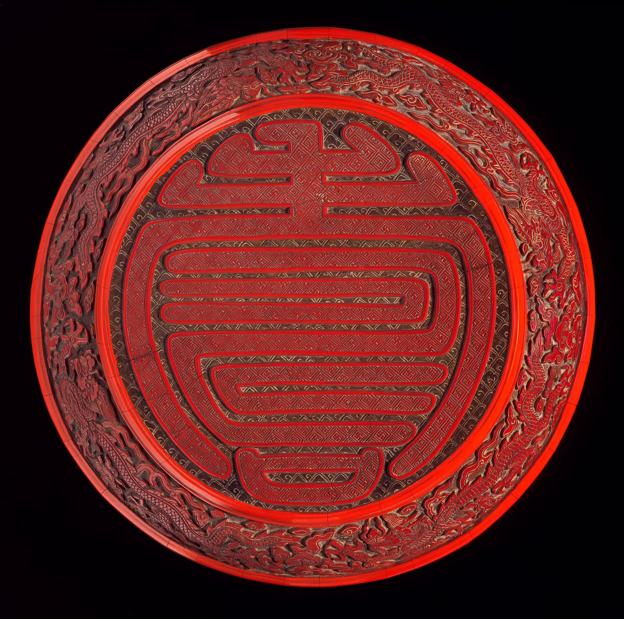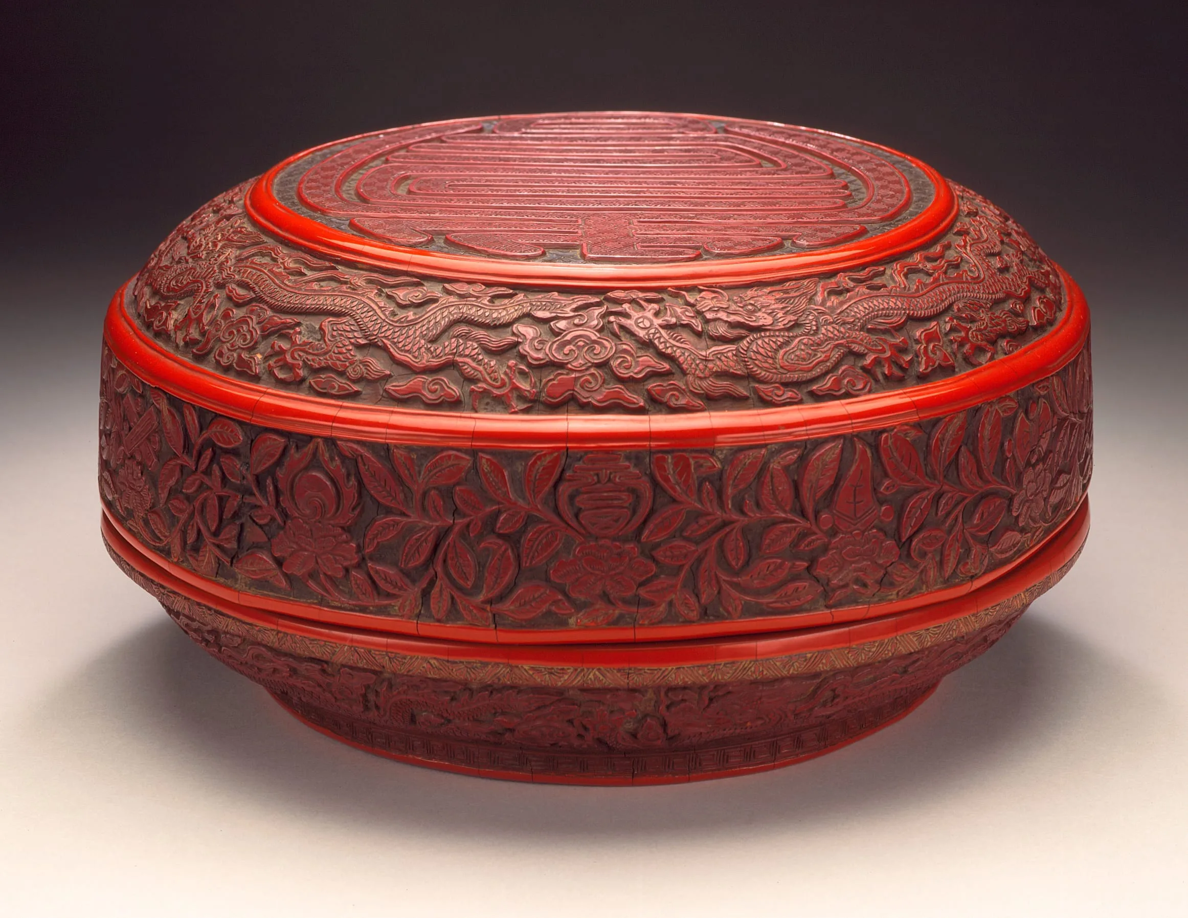 - Carved red, brown, and black lacquer on wood core (ticai)