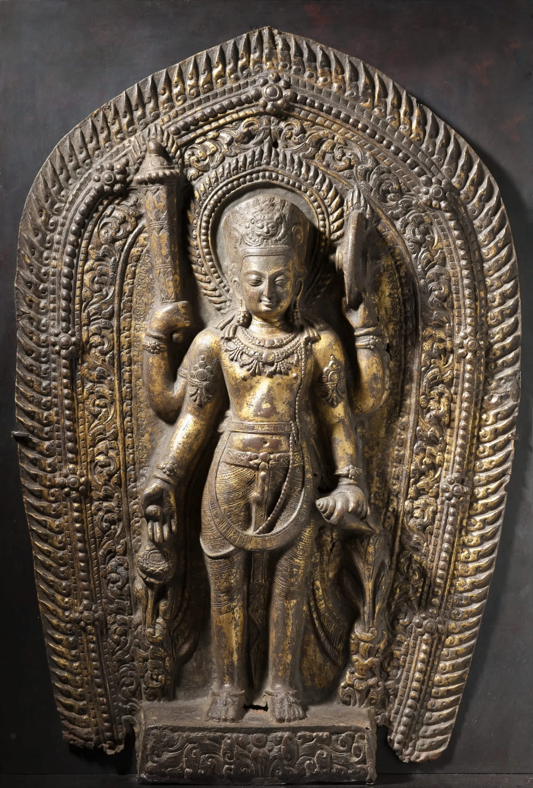 This repoussé gilt copper alloy plaque was likely originally a metal sheath for a stone or wooden image (kosha or kavaca) of Vishnu, the Hindu god of preservation. It depicts the deity as nimbate and wearing a tall square crown (kirita mukuta) adorned with a "Face of Glory" (kirttimukha) and the Brahmanical sacred thread (yajnopavita) over his left shoulder. He stands in a stiff, frontal pose (samapada sthanaka). Vishnu has four arms bearing his standard attributes. In his upper right hand, he carries a mace (gada). In his upper left hand, he holds a flaming discus (chakra). In lower left hand, he grasps a conch (shankha). His lower right hand is extended in the gesture of charity (varada mudra) and holds the fruit of knowledge (jñana palam). An open lotus is beneath his lower right hand, while a closed lotus is under his lower left hand. Vishnu is atypically ithyphallic (urdhva linga), which Pratapaditya Pal suggests is because he is a yogi in control of his passions (Pal 1985, p. 95, no. S13). Vishnu is surrounded by a complex flaming aureole (prabhavali).