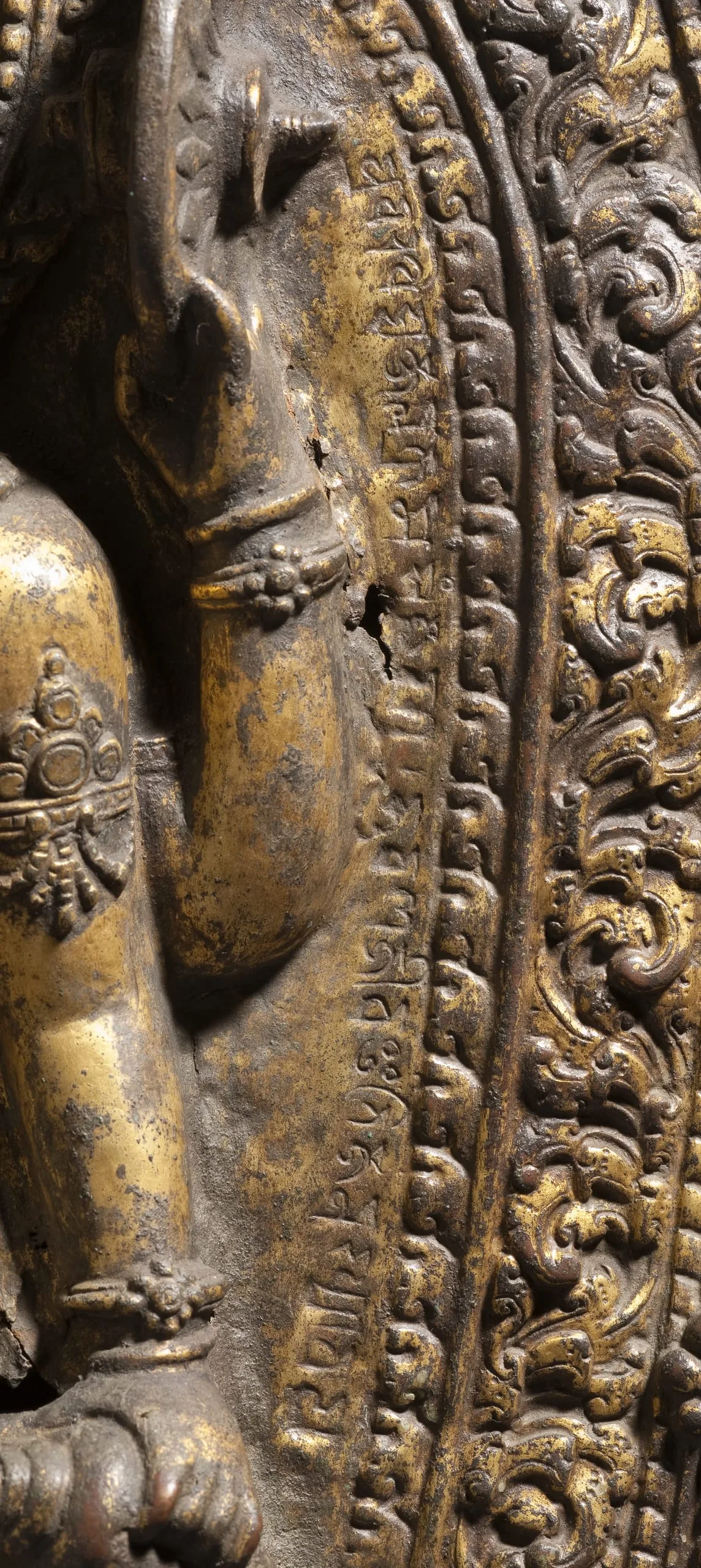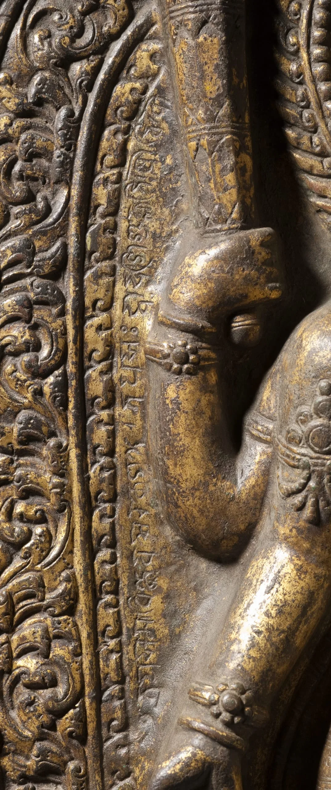 A devanagari inscription on the aureola’s inner border states, In the year of 300 [1180 CE] on Monday, the twelfth day of the bright fortnight of the month of Magha [January-February], Bhuvana Jiva of the most excellent Vaidya family, for this glory… The inscription continues under the base but is illegible. The inscribed date was formerly read as (Nepal samvat) 103, corresponding to 983 CE (Pal 1985, p. 235, no. S13), but was retranslated by Gautama Vajrachharya (see Ian Alsop, "Problems in Dating Nepalese Metal Sculpture: Three Images of Visnu (corrected)," https://www.asianart.com/articles/visnu/index.html).