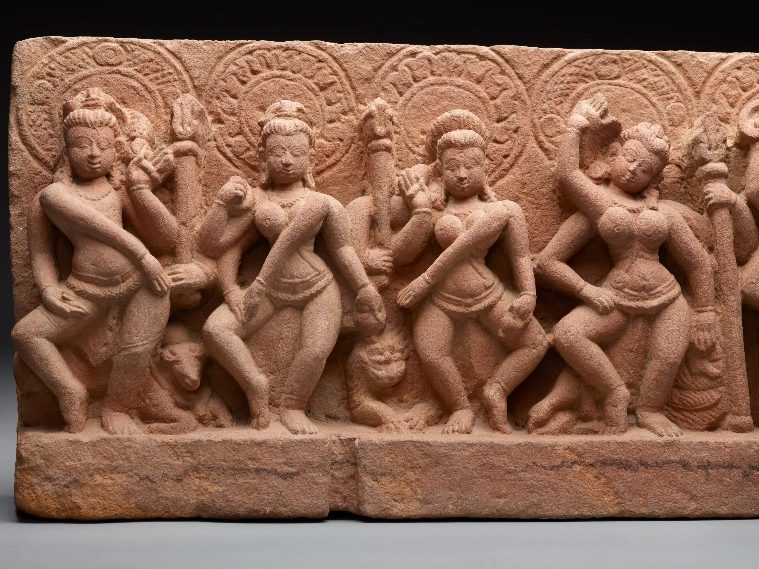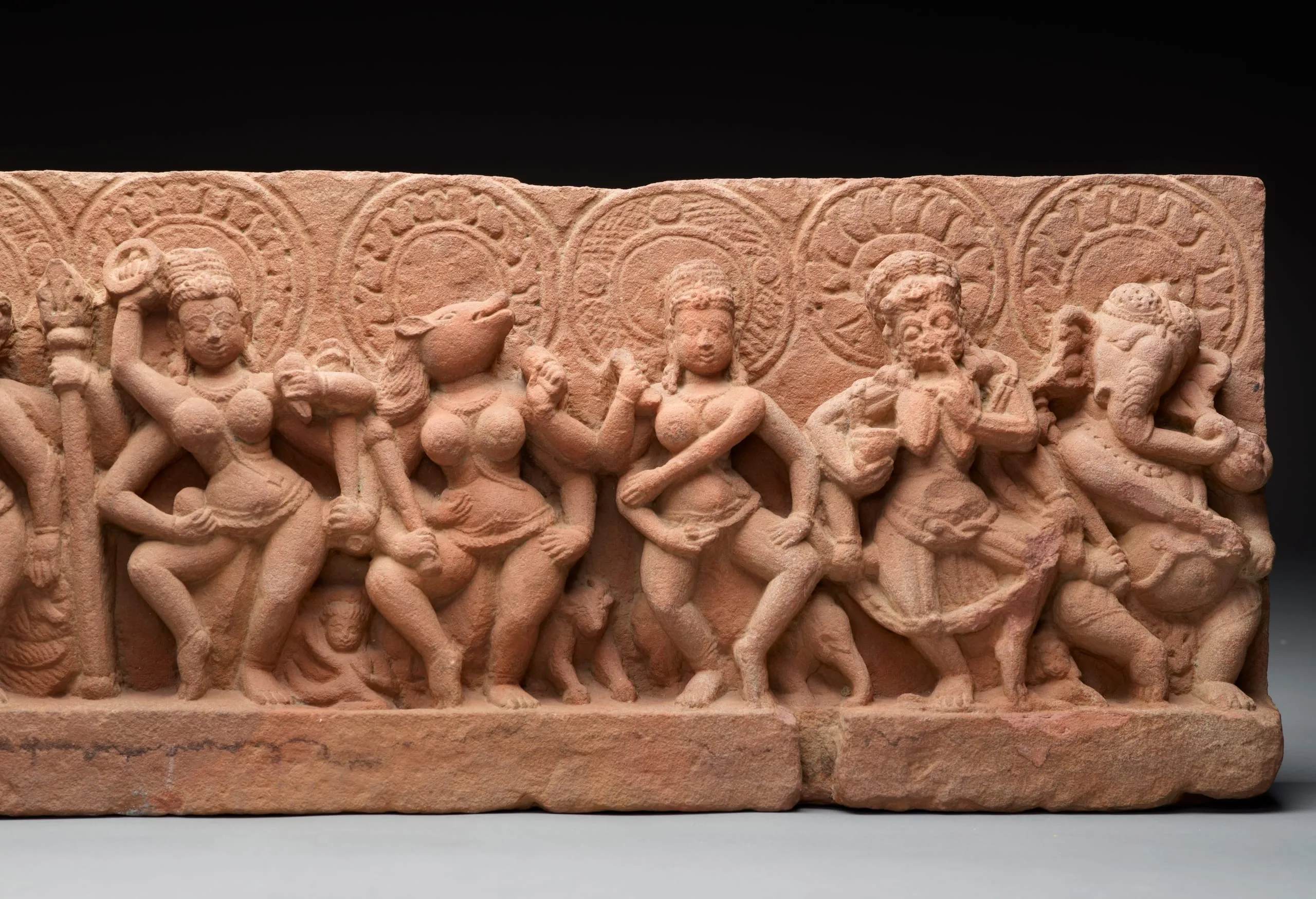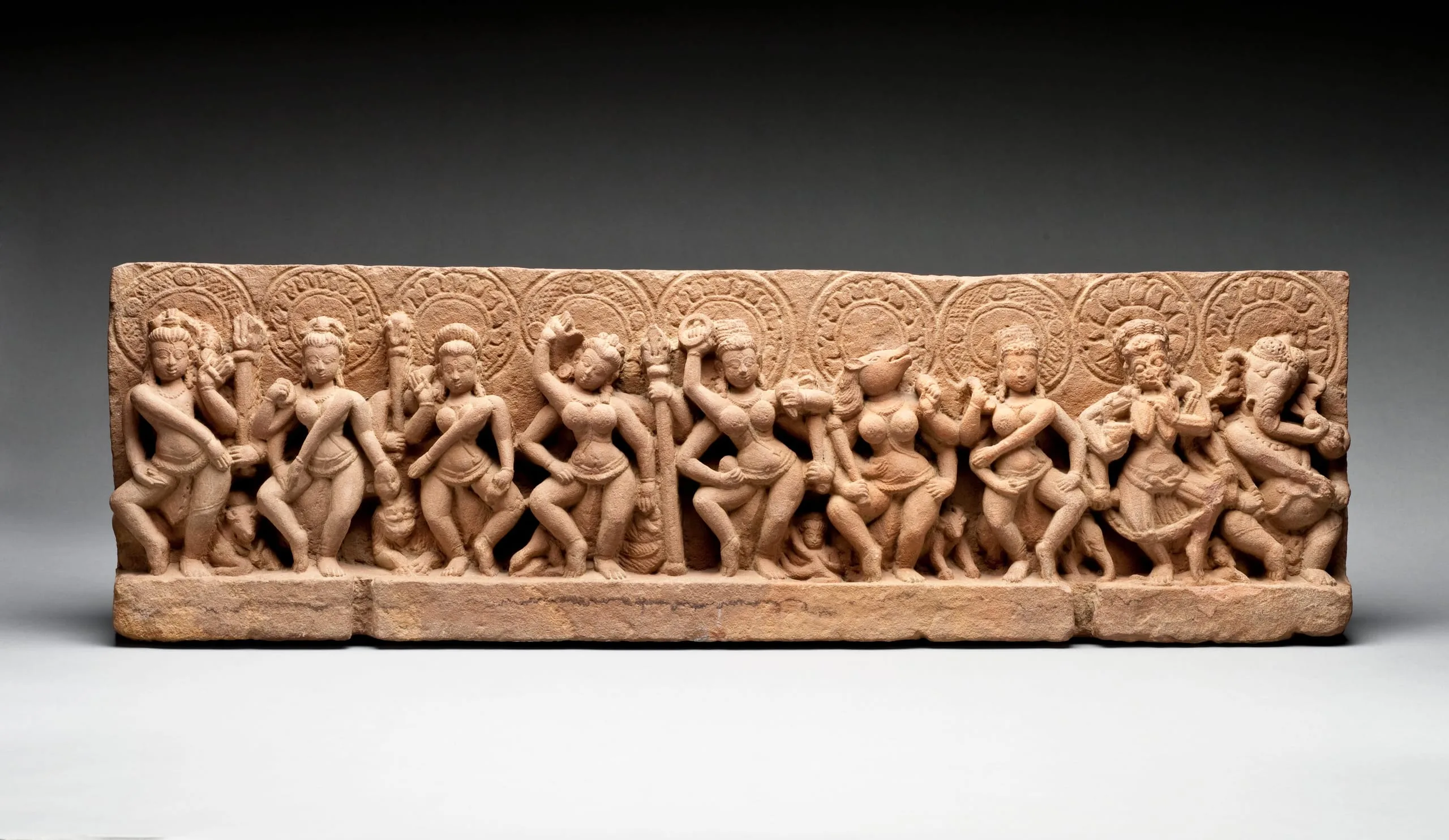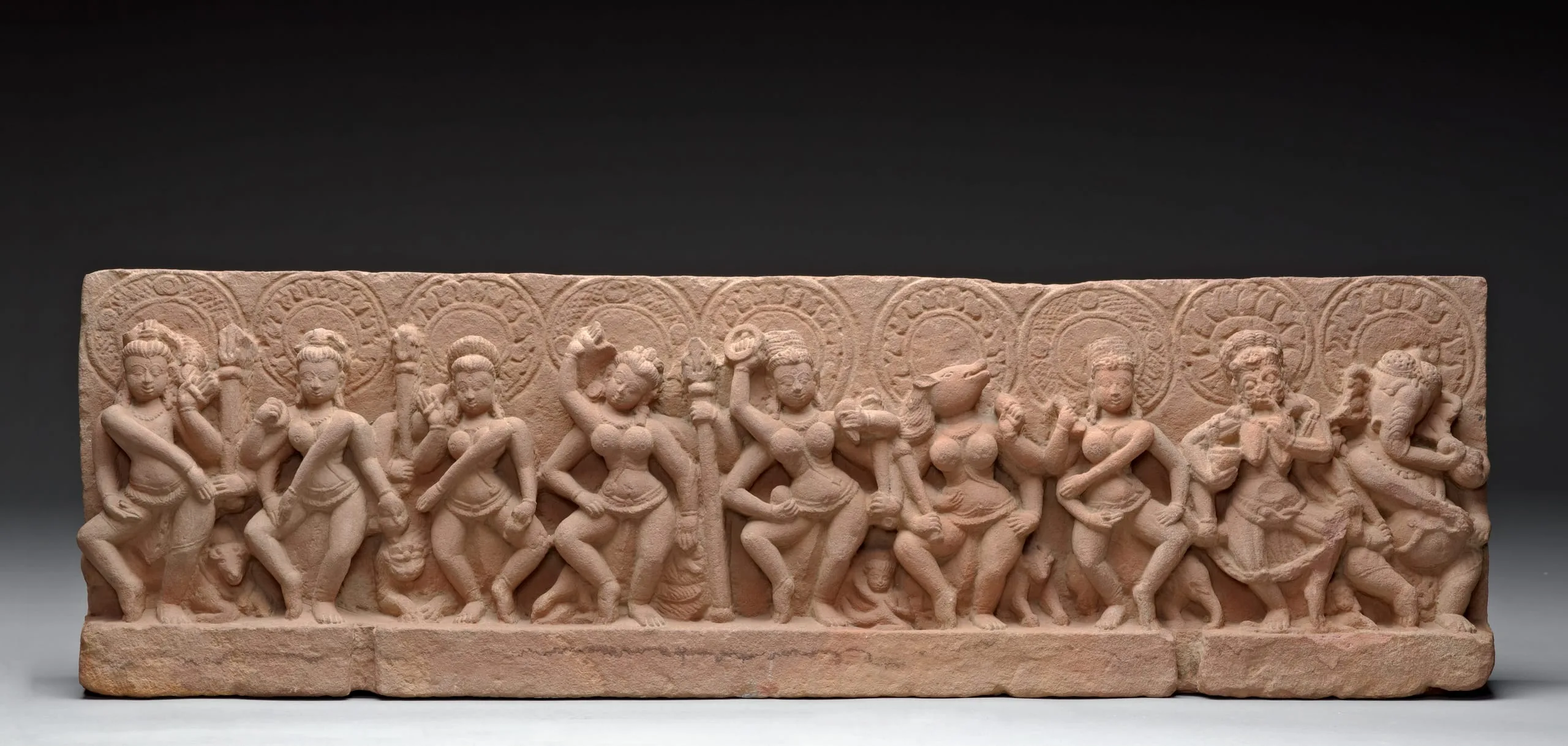 From left to right, the four-armed nimbate deities represented here are Virabhadra, holding a trident (trishula) and with his bull mount, Nandi; Brahmani (Brahma), holding an ascetic’s water pot (kamandalu); Maheshvari (Mahesvara or Shiva), holding a trident, and with an atypical lion (sinha) mount; Kaumari (Kumara), holding a lance (shakti), and with her peacock (mayura) mount; Vaishnavi (Vishnu), holding a discus (chakra), mace (gada), conch (shankha), and probably a lotus bud (padma), and with her half-human, half-avian mount, Garuda; the boar-headed Varahi (Varaha) holding a club (danda), and with her buffalo (mahisha) mount, Indrani (Indra), holding a thunderbolt (vajra), and with her elephant (gaja) mount; the emaciated Chamunda (Durga), holding a pestle (musala), displaying the gesture of admonition (tarjani mudra), and with her corpse (mritaka) mount; and Ganesha, holding a bowl of sweetmeats (ladhus). See also M.71.110.2.