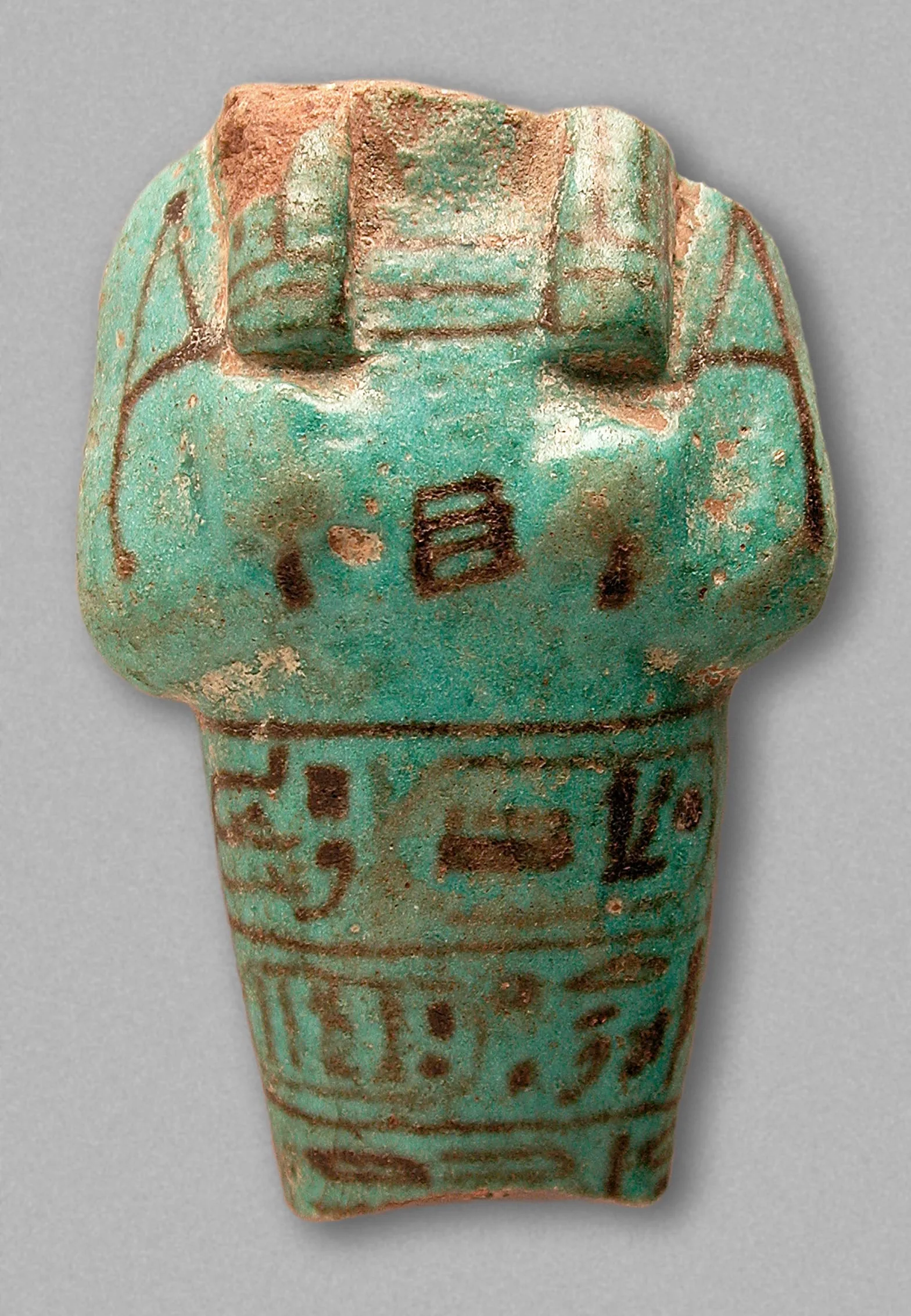 Small ancient Egyptian faience figure with turquoise glaze, forked crown, and incised hieroglyphic inscription covering the lower body