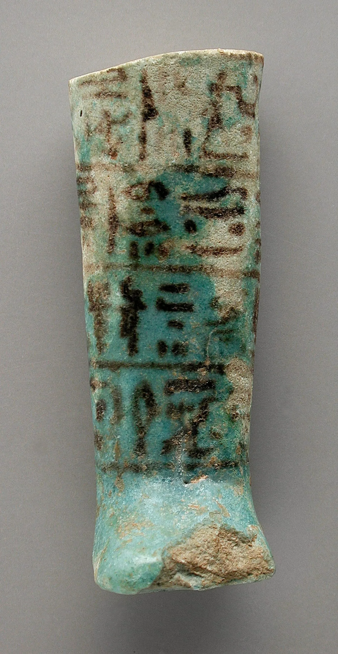 Fragment of an ancient Egyptian faience object with turquoise-blue glaze, covered in incised hieroglyphic text in dark pigment, tapering from top to a broken base
