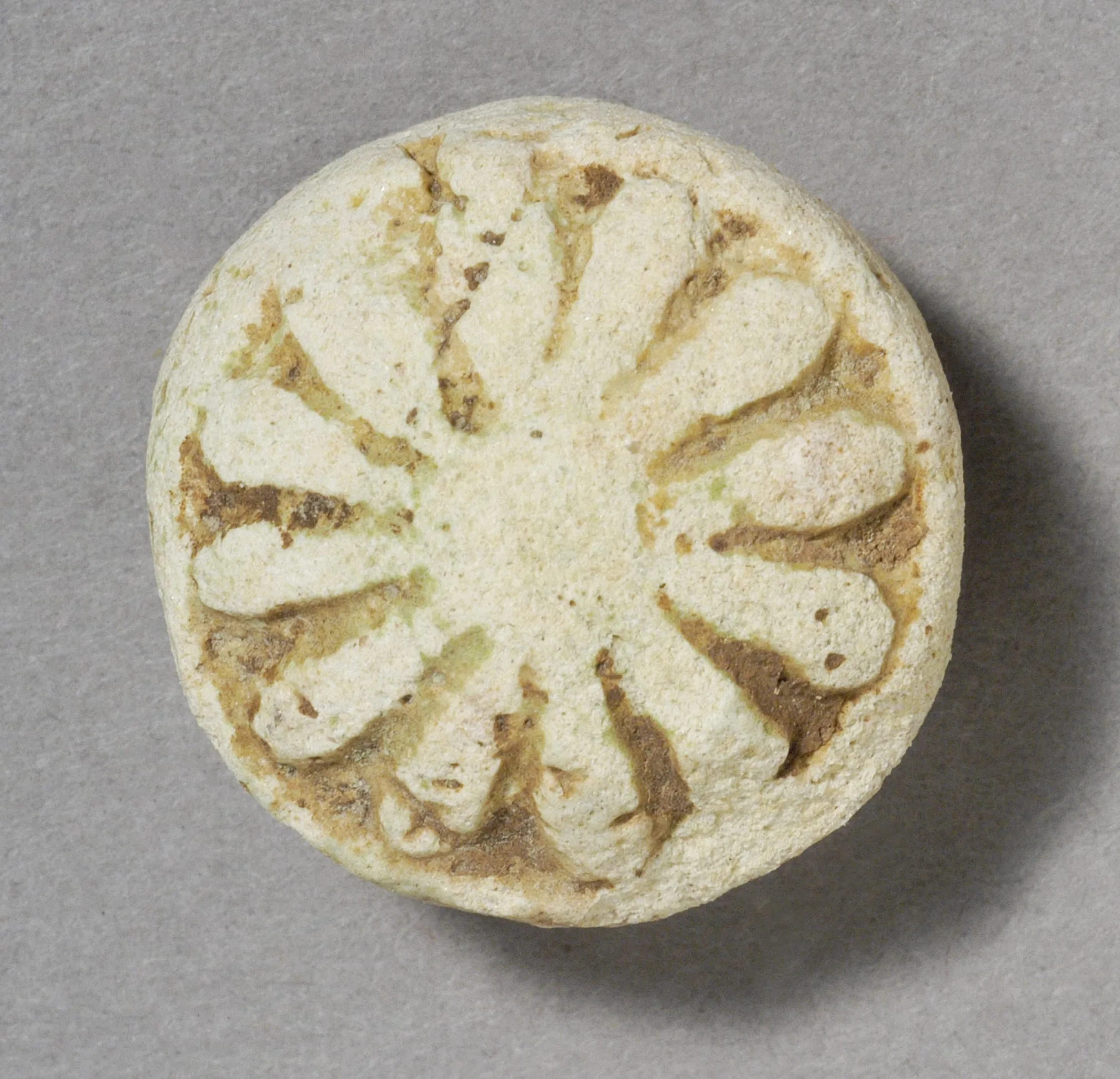 Small circular ceramic or faience disk with a molded rosette of twelve radiating petals on the top face, pale white-green glaze with brown residue in the recessed channels