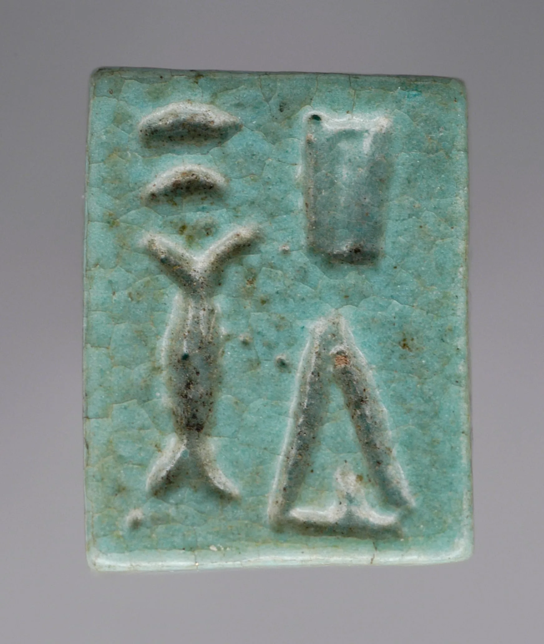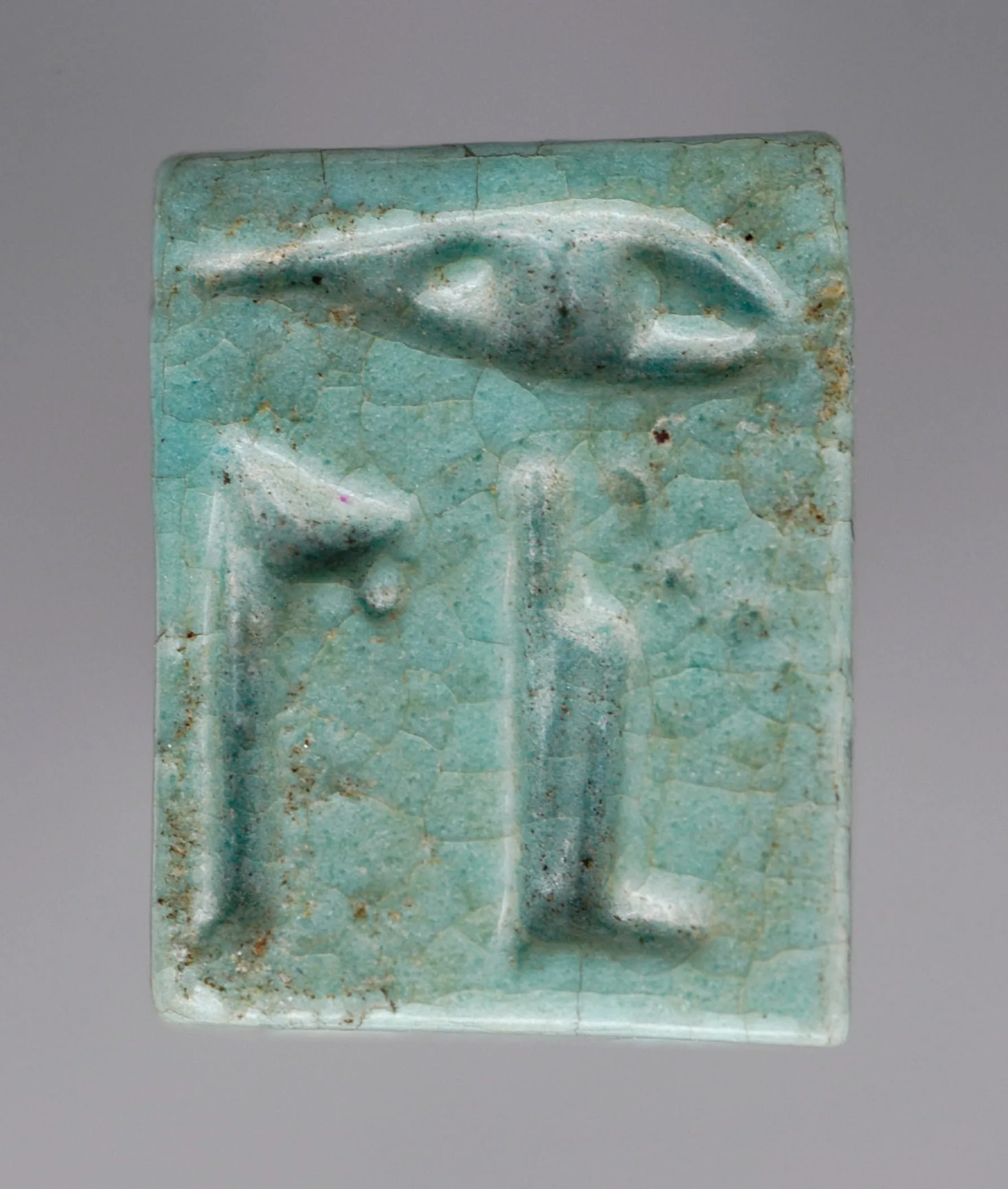 Rectangular Egyptian faience plaque with crackled turquoise glaze, bearing raised hieroglyphic symbols including a wedjat eye above two vertical signs.