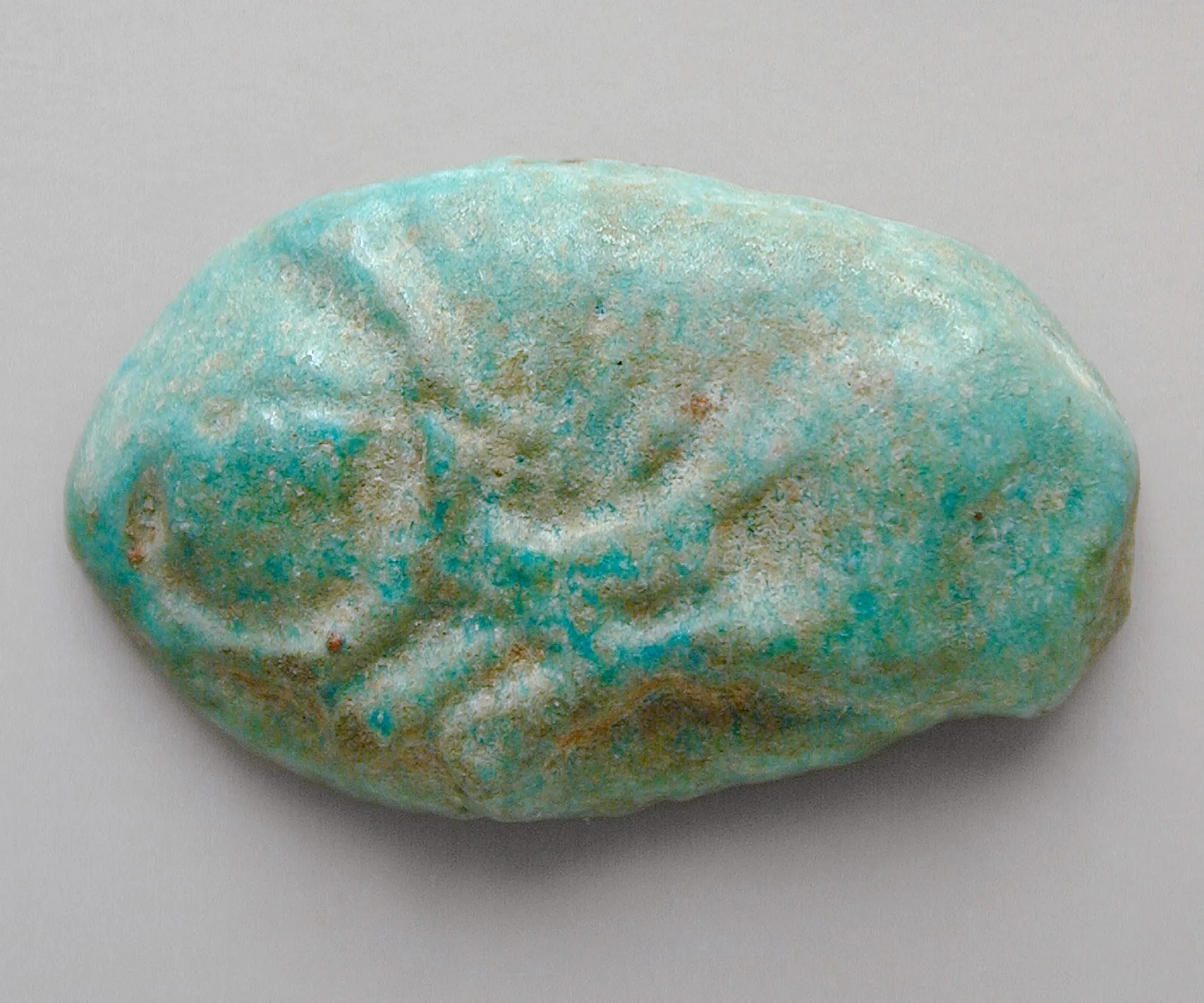 Small oval ancient Egyptian faience object with a turquoise glaze, low-relief spiral and radiating line carving on the domed upper surface, with areas of white and brown wear