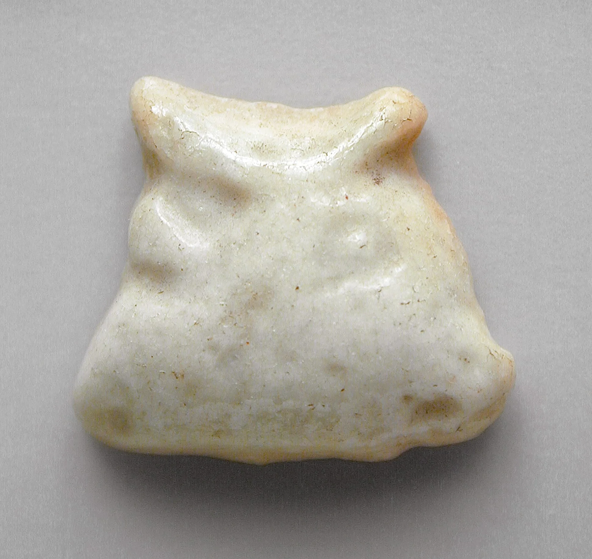 Small carved stone sculpture in creamy off-white, roughly trapezoidal with two rounded lobes at the top and shallow carved depressions on the face, suggesting an animal head