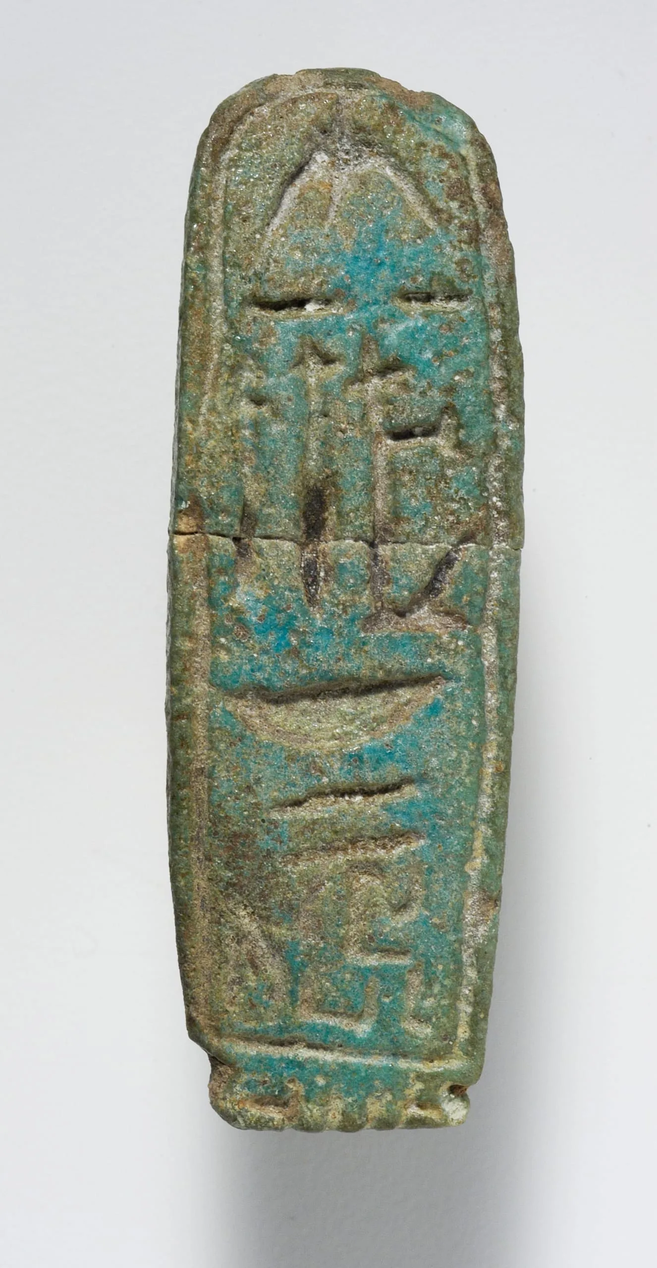 Small vertical faience plaque with incised Egyptian hieroglyphs in a single column, mottled turquoise-blue glaze over a gray ceramic body