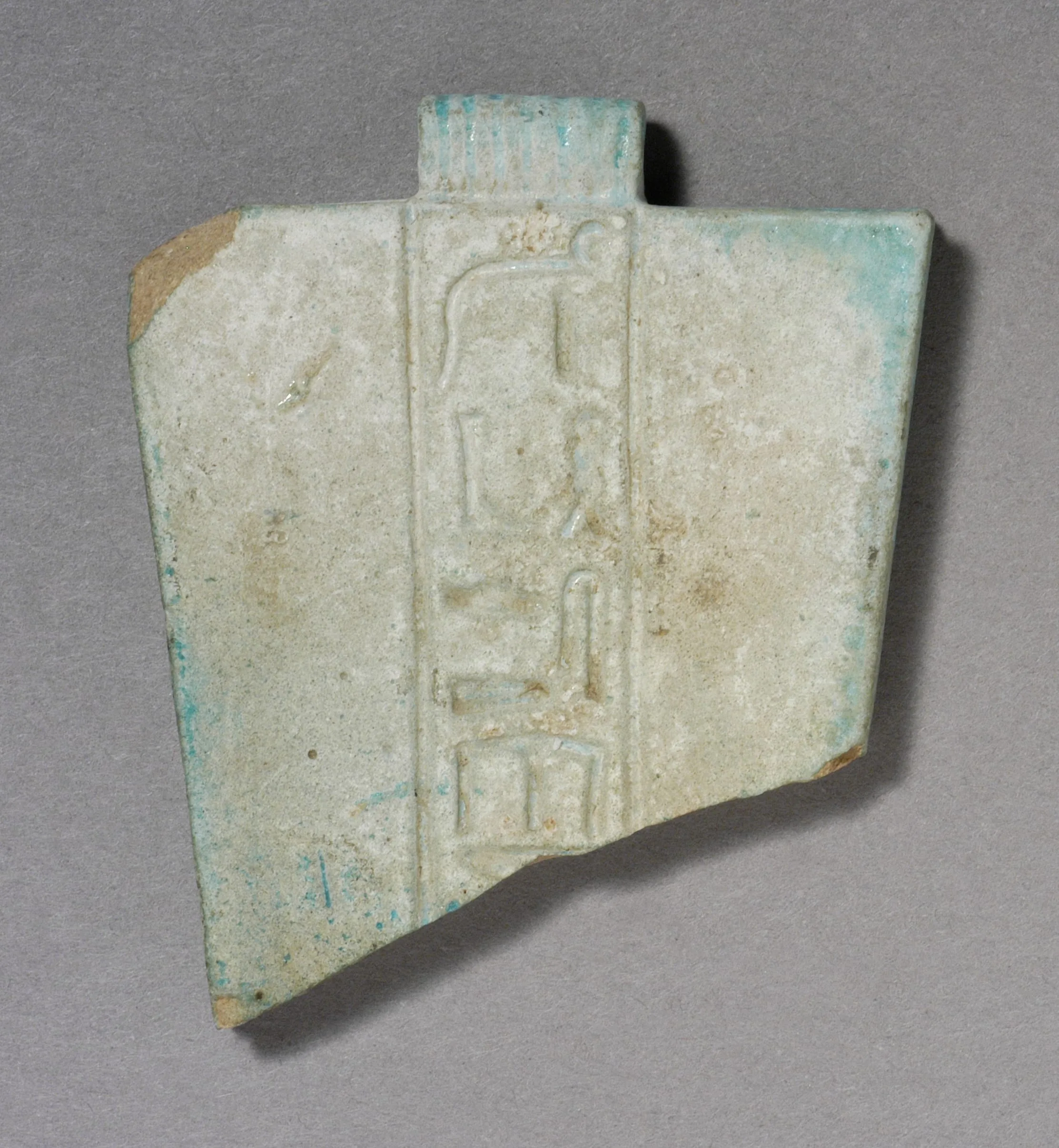 Fragment of an Egyptian faience plaque with a suspension loop, pale gray-white glaze with turquoise patches, and a central column of low-relief hieroglyphs