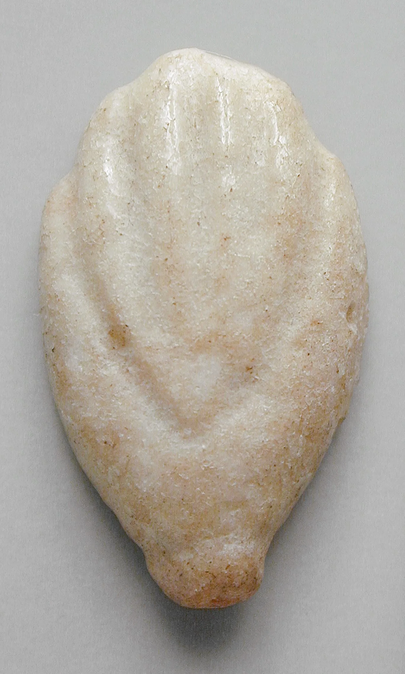 Small carved stone object, possibly alabaster, with an ovoid form and shallow concave interior featuring radiating ridges, in chalky white with tan mottling