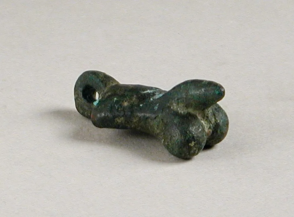 Small bronze phallic amulet with suspension loop, teal-green patina over dark olive-brown surface, solid cast with wing-like side projections