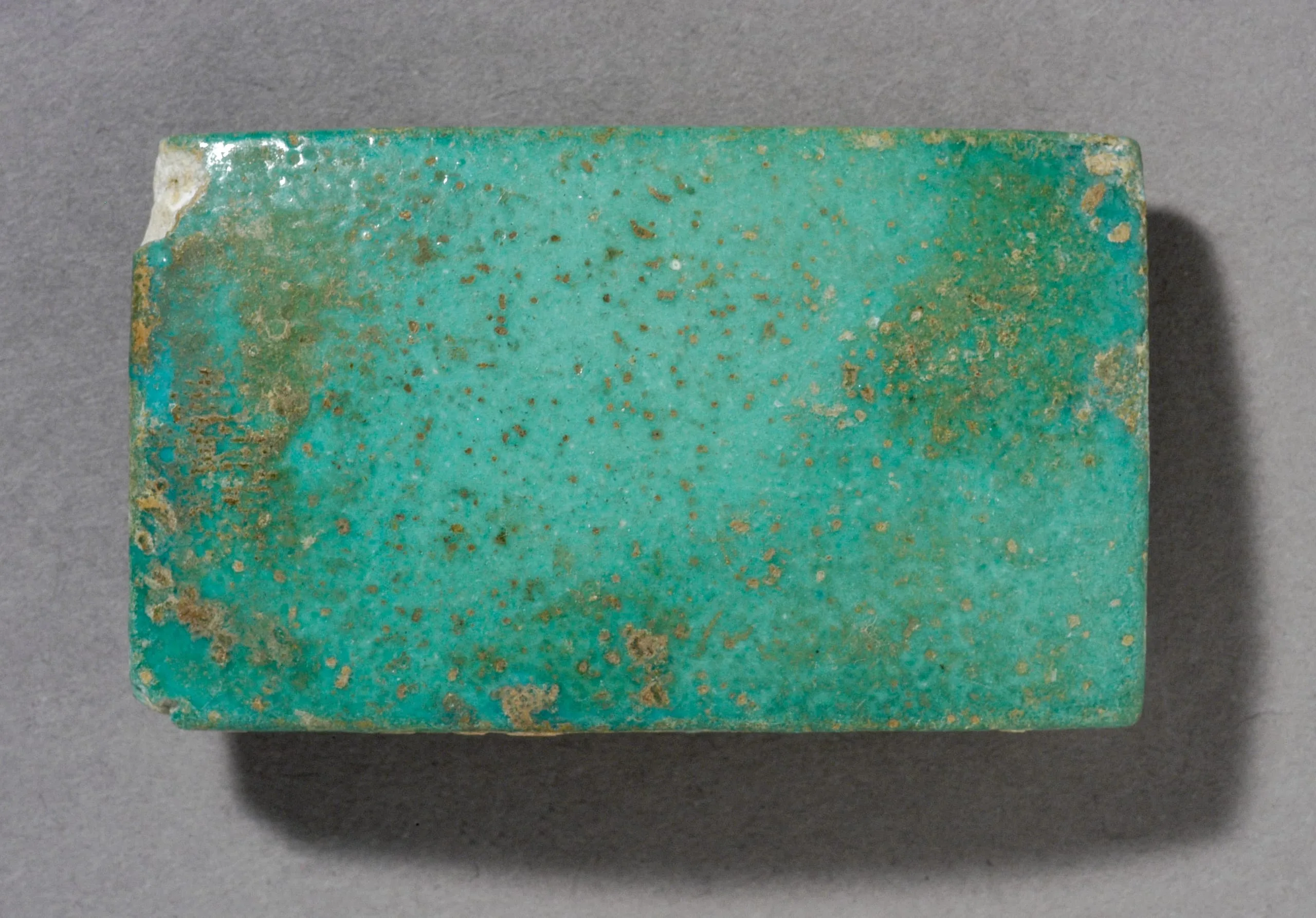 Small rectangular faience or glazed ceramic block with bright turquoise surface, scattered brown speckles, and areas of surface deterioration at the corners