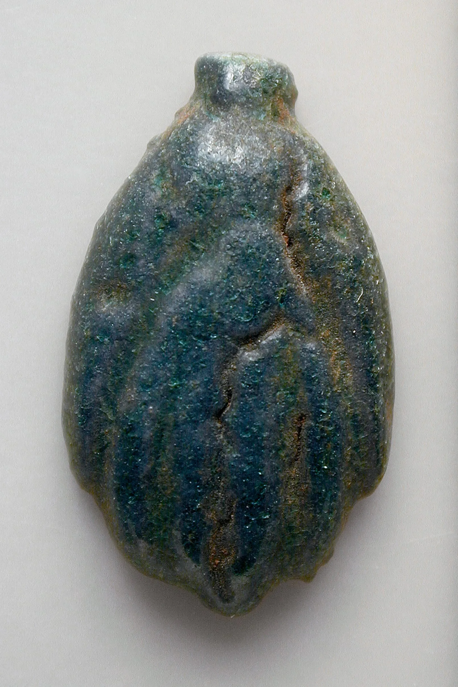 Small glazed amulet or pendant with egg-shaped, ribbed form in teal, slate blue, and gray-white glaze with granular surface texture