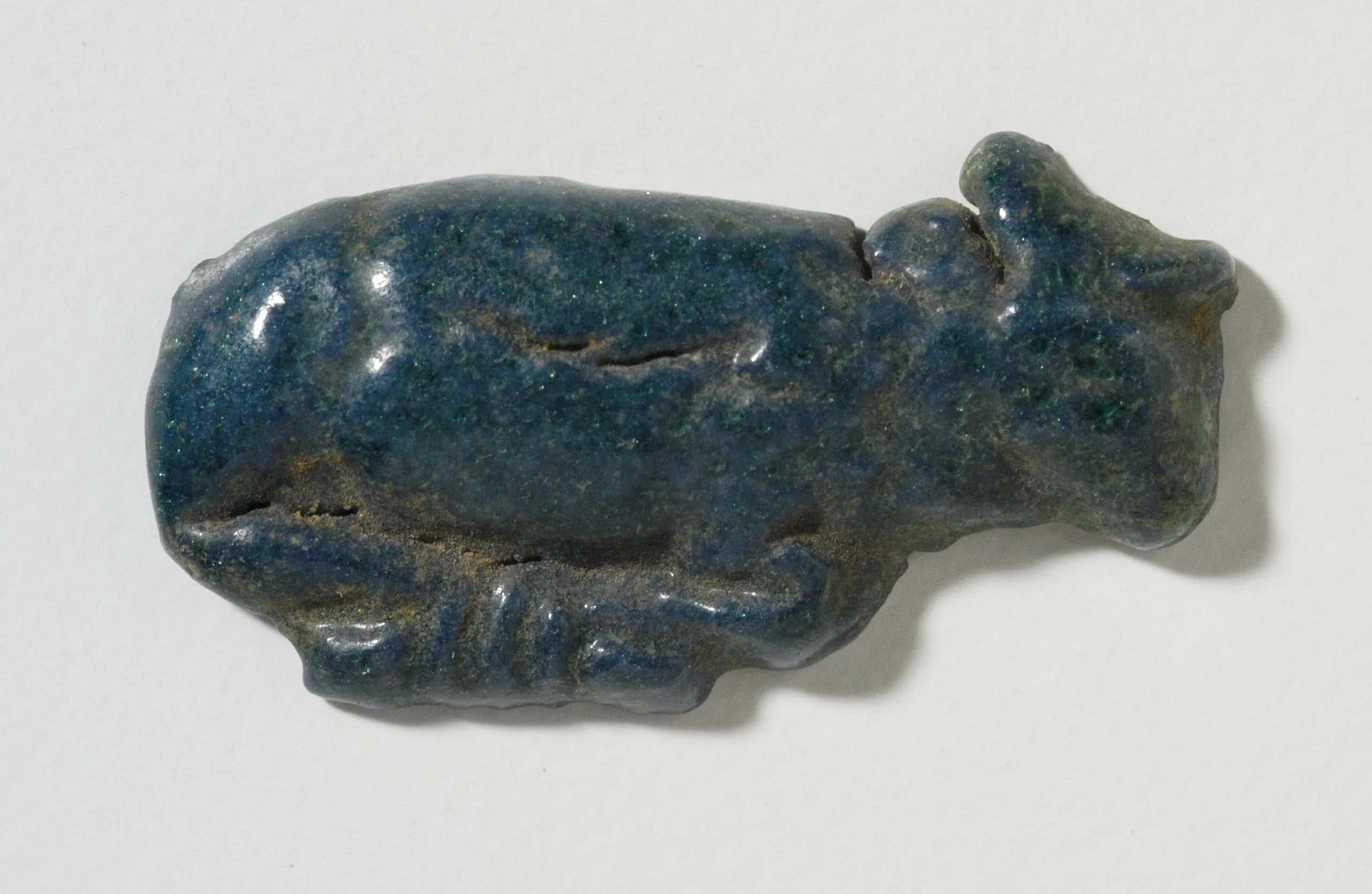 Small glazed ceramic amulet in the form of a recumbent bovine, covered in mottled slate blue and teal glaze with worn olive-brown patches