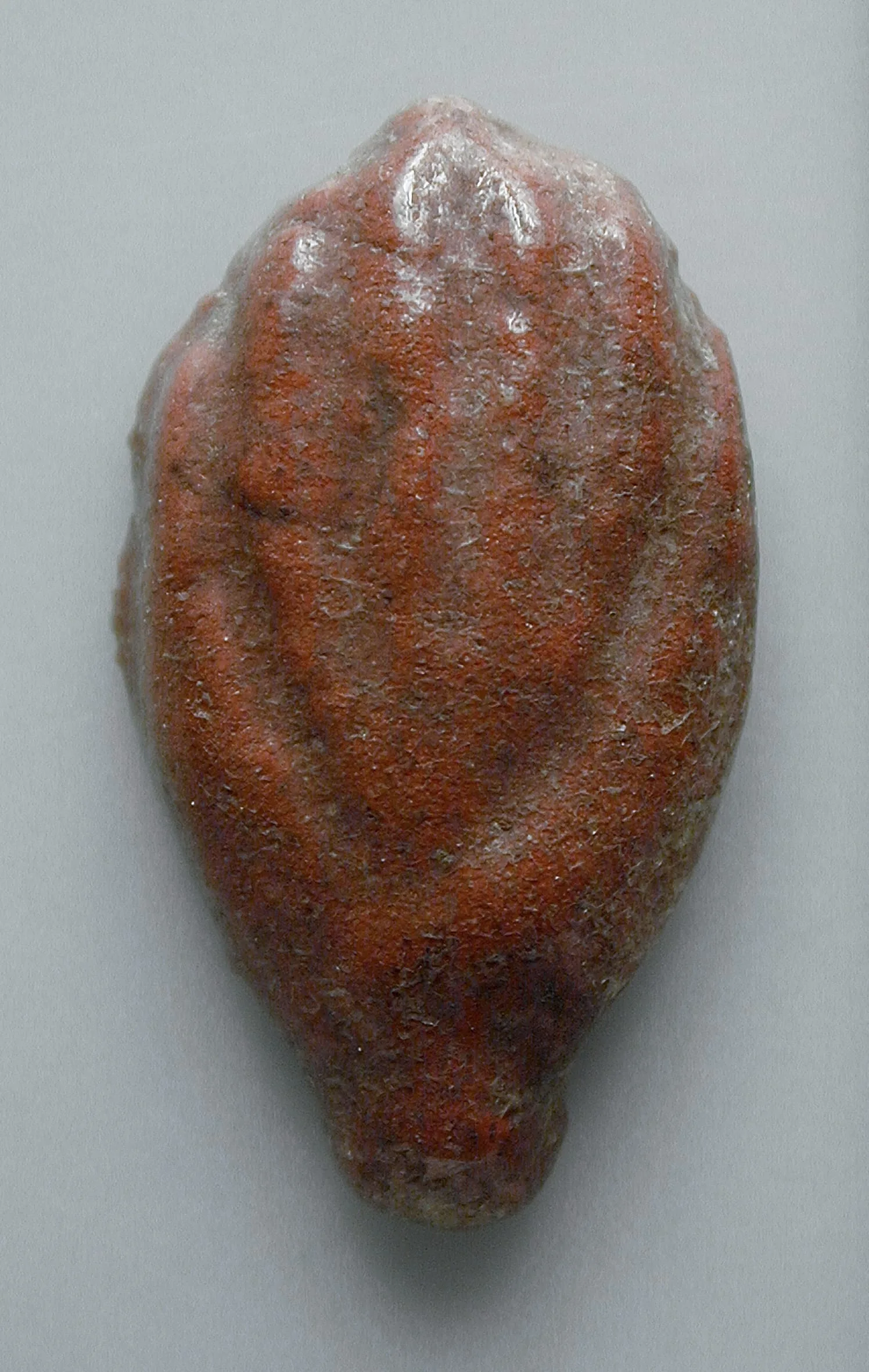 Small teardrop-shaped sculpture in brick-red and rust stone or clay, with a central vertical depression flanked by low ridges and patches of gray-white encrustation