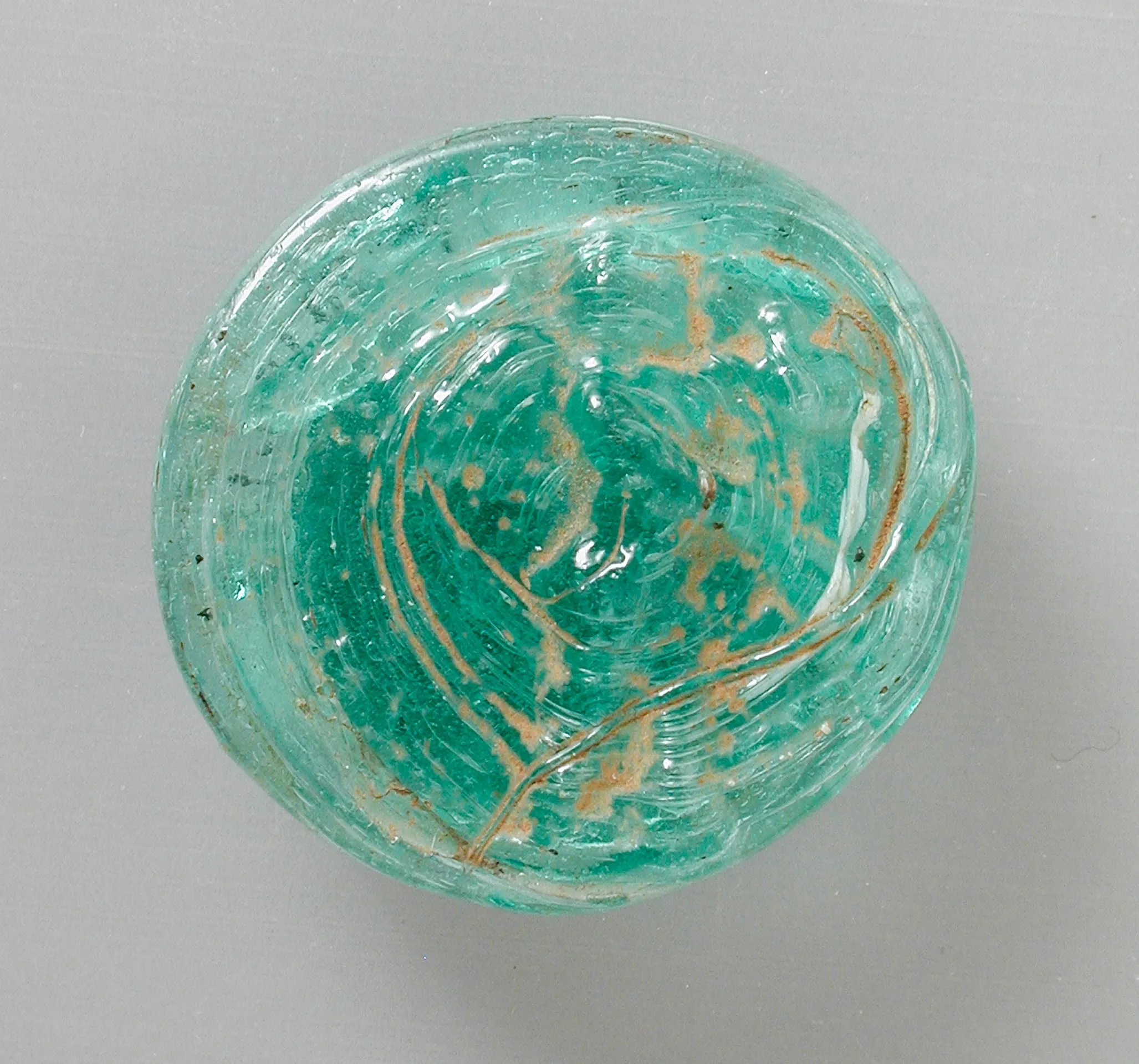 Glass cup or bowl seen from above, translucent aquamarine with spiraling ridges and sandy mineral deposits across the interior