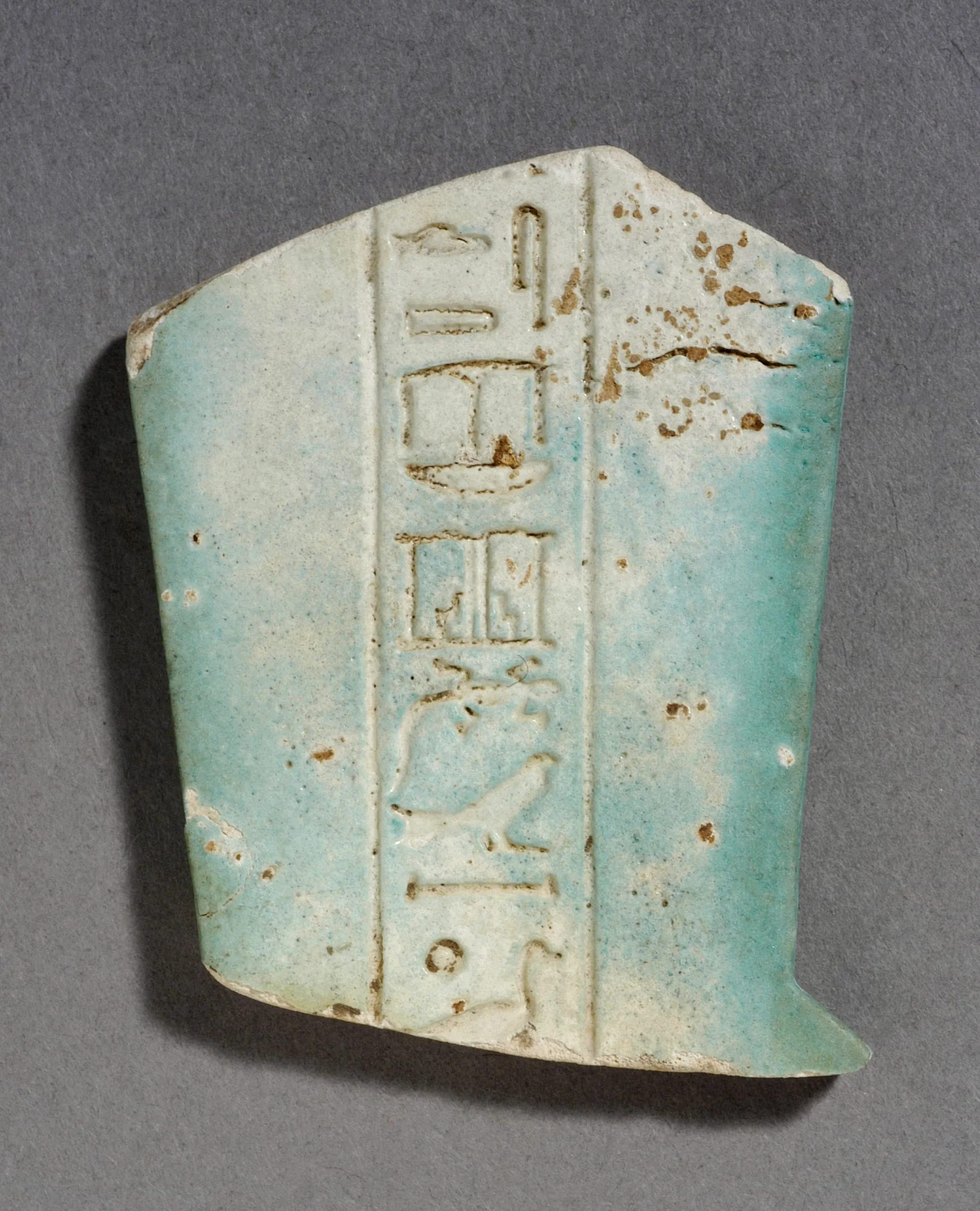 Turquoise-glazed ceramic fragment with incised Egyptian hieroglyphs in a vertical column, worn surface with rust-brown staining and broken edges