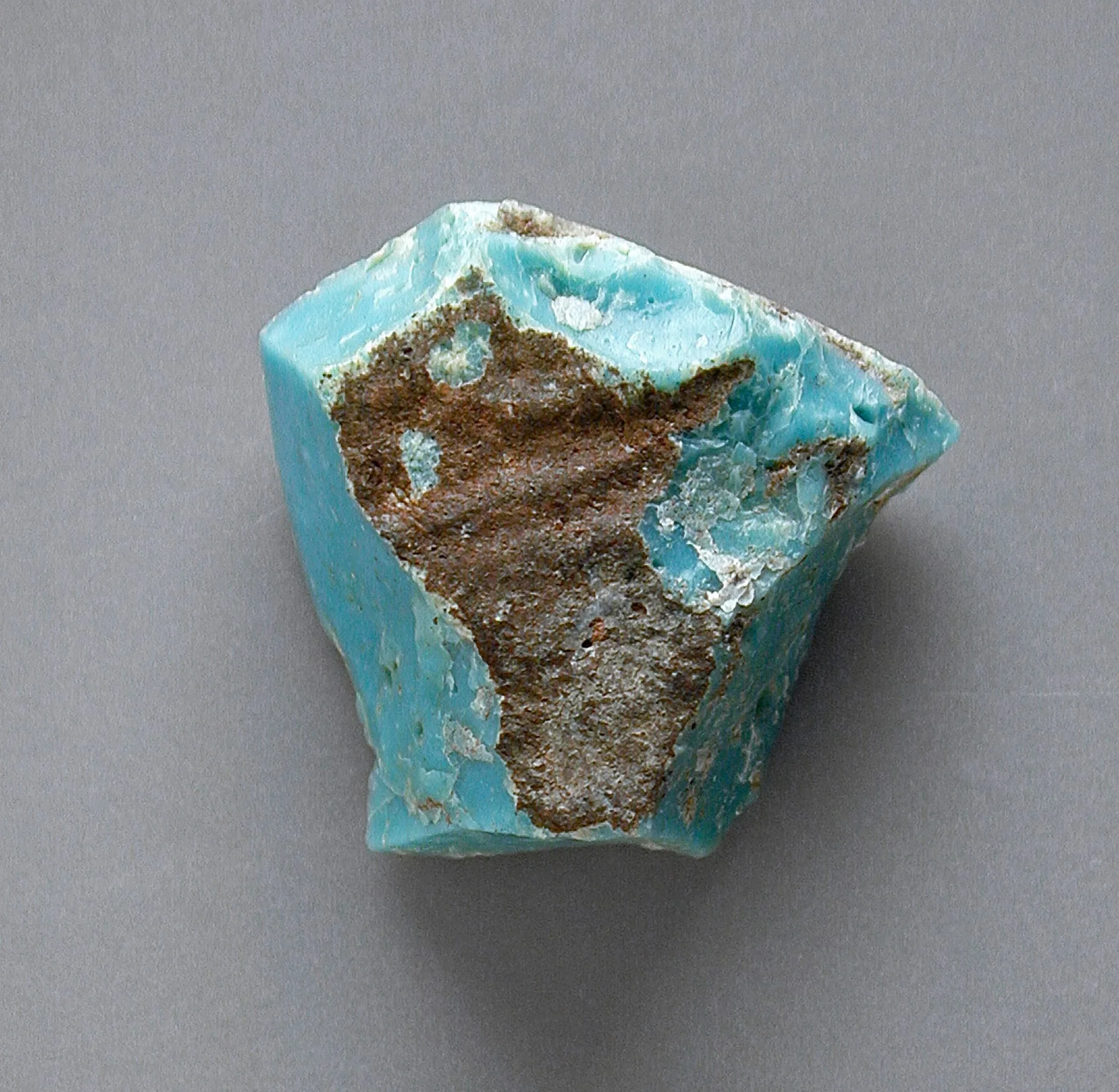 Raw turquoise mineral specimen with vivid sky-blue surfaces and a large irregular patch of brown and tan matrix, viewed slightly from above against a gray background