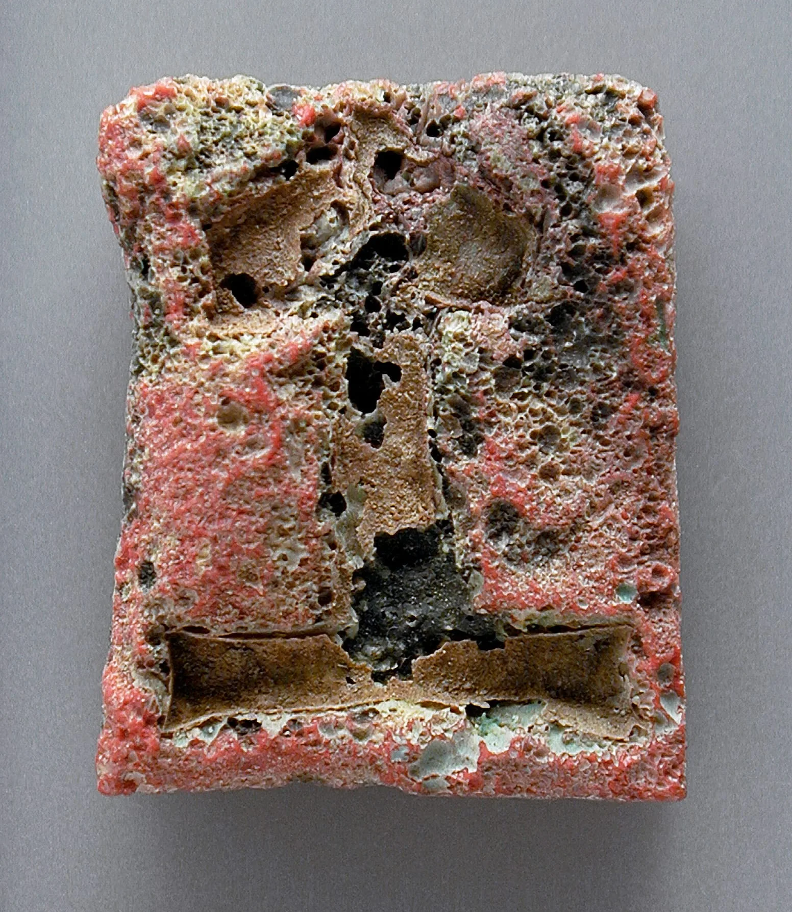 Small rectangular sculpture with heavily pitted, coral-red and tan surface, featuring a large cross-shaped open cavity at the center