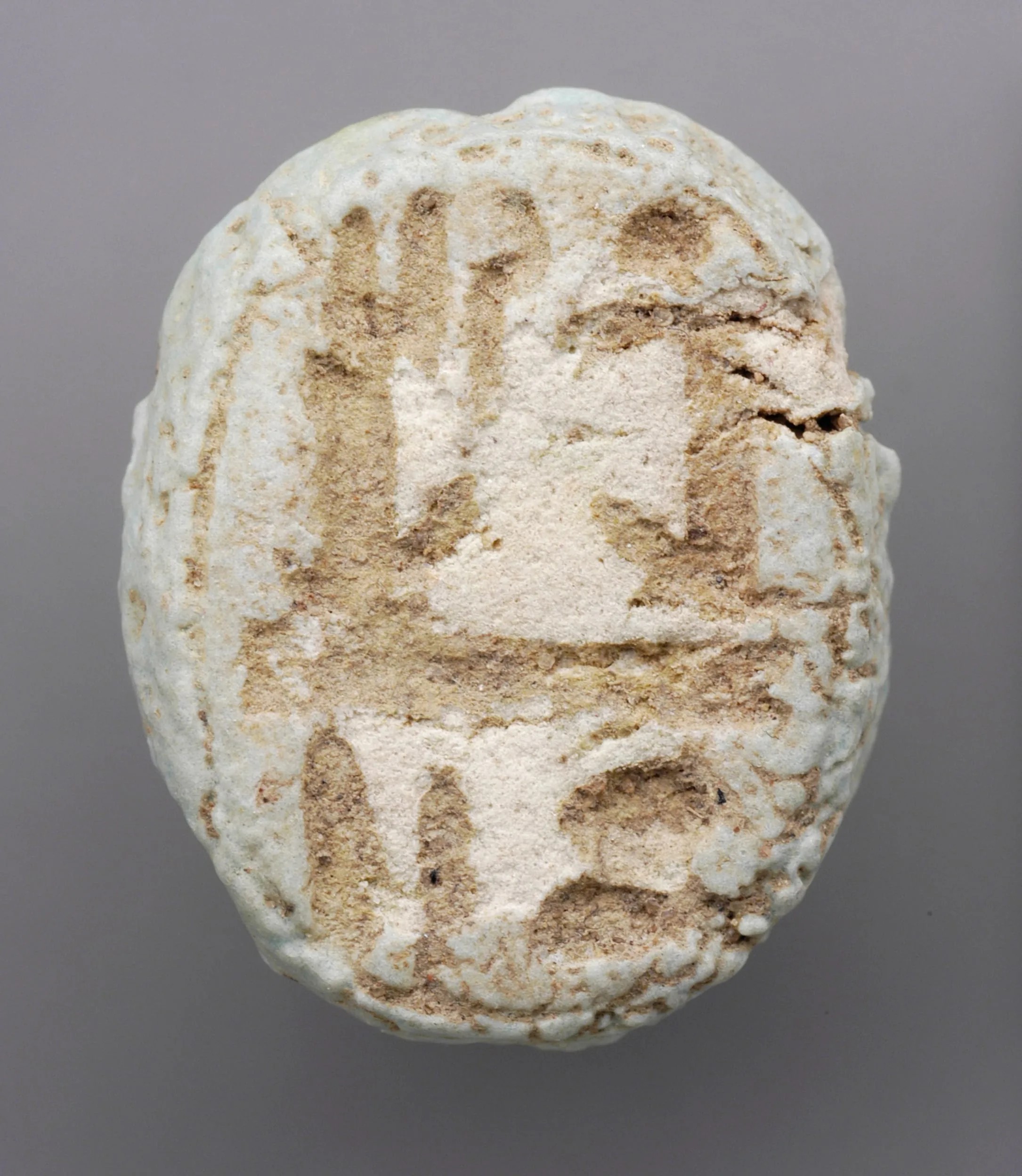 Small Egyptian scarab amulet in faience, flat underside shown with incised hieroglyphic signs arranged in two registers, chalky off-white surface with tan weathering