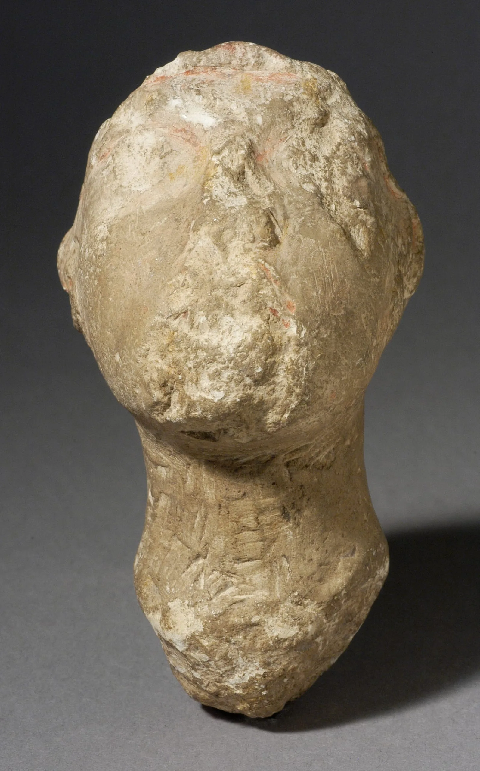 Small plaster sculpture of a human head seen from the rear, with rough, heavily textured surface and traces of red pigment on the crown