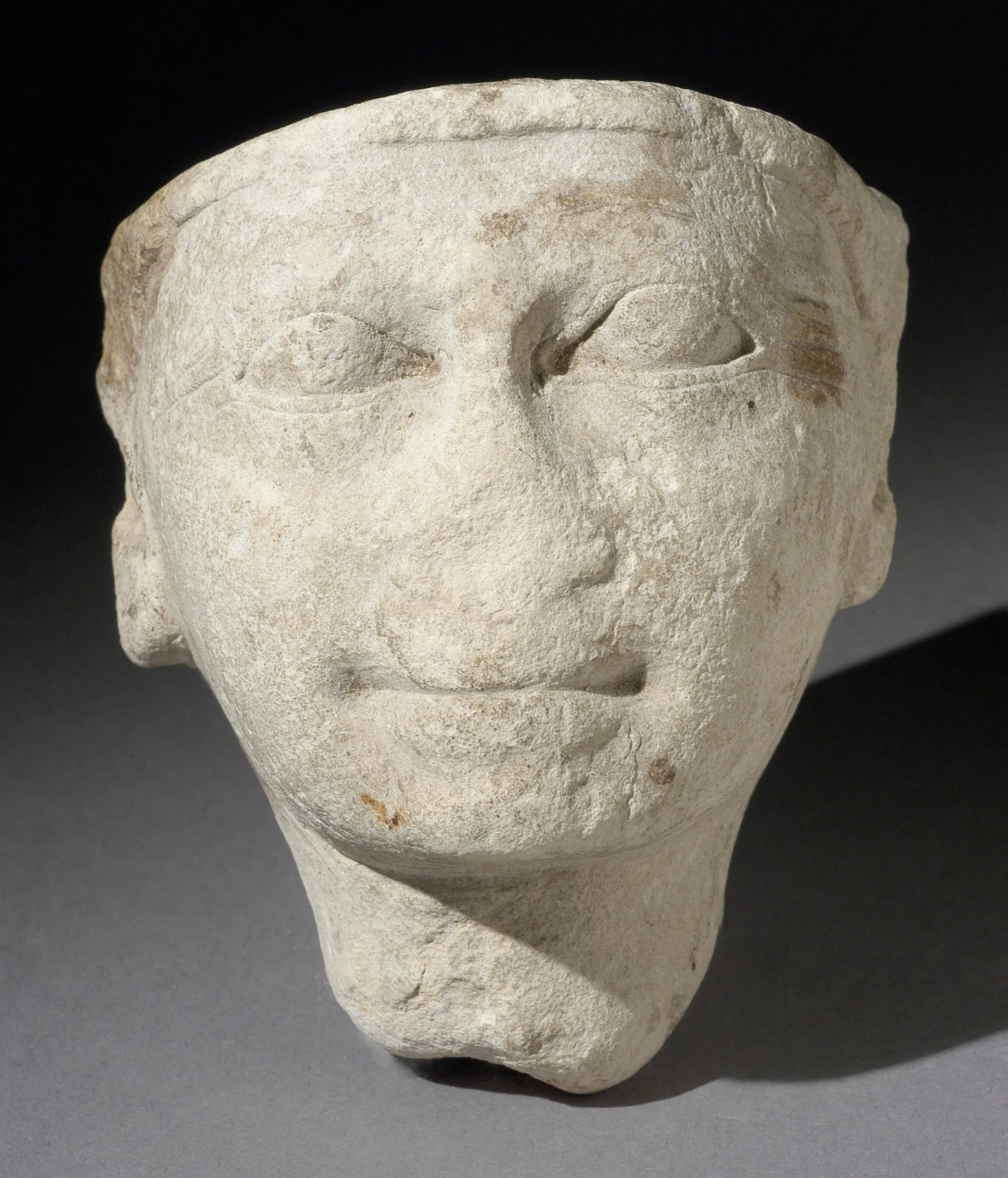 Carved limestone or marble head facing forward, with heavy-lidded eyes, wide nose, and flat-cut crown, heavily weathered surface with tan and rust-colored deposits
