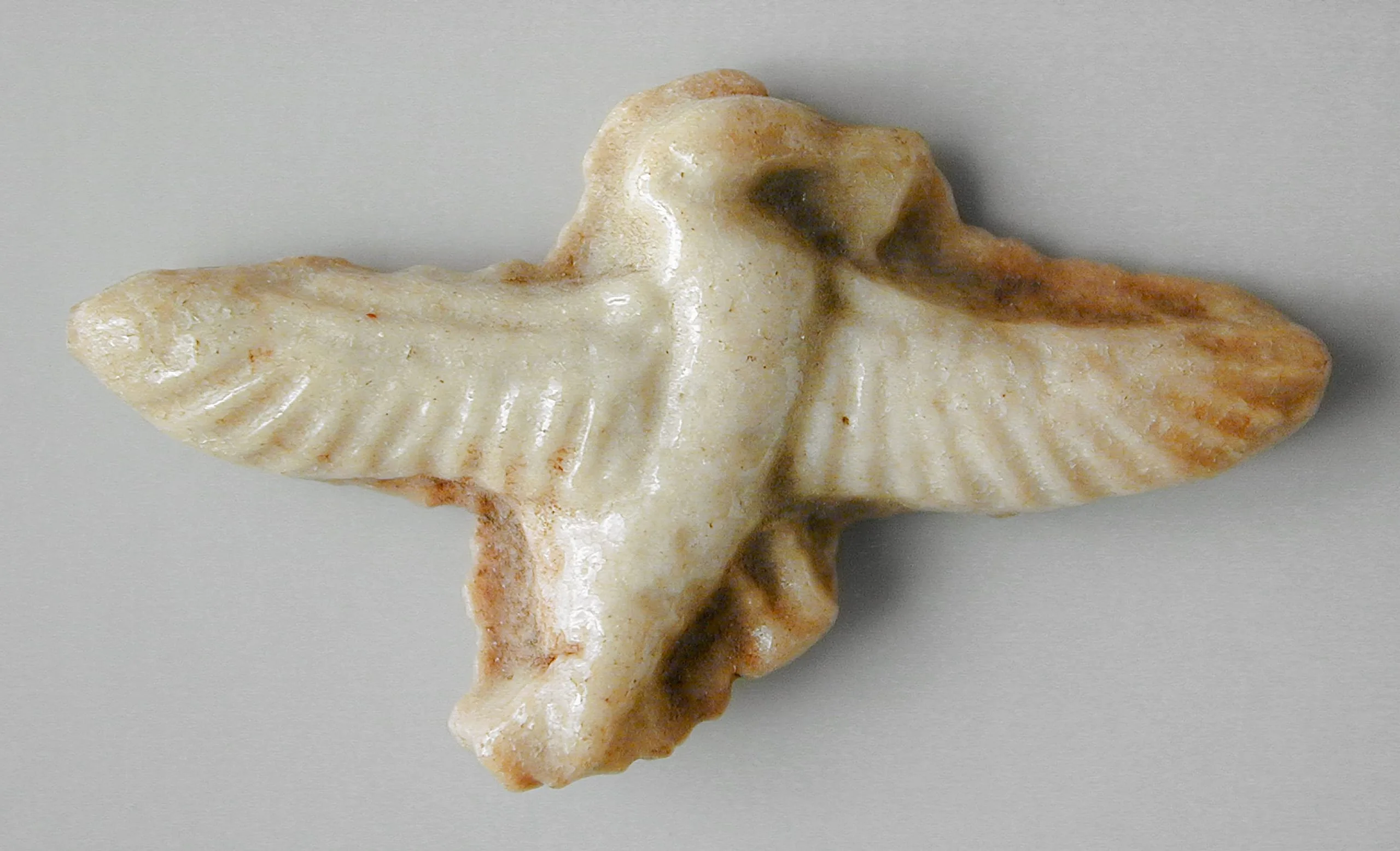 Small alabaster sculpture of a bird with wings fully outstretched, ivory-white with russet-brown streaks, carved feather details on wings, short hooked beak