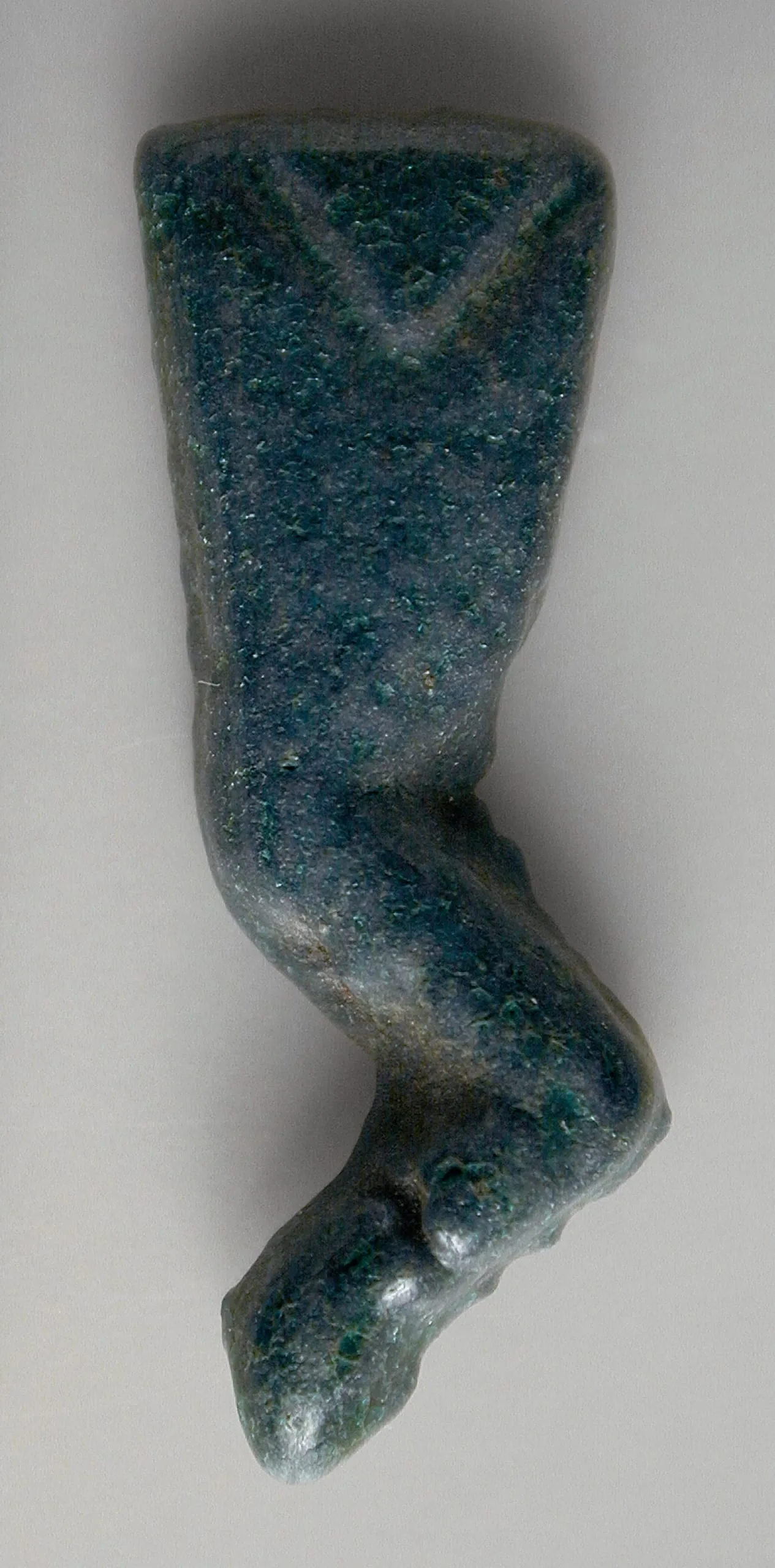 Small faience sculpture of a human leg and foot, mottled teal-blue glaze with incised V-shaped lines near the top