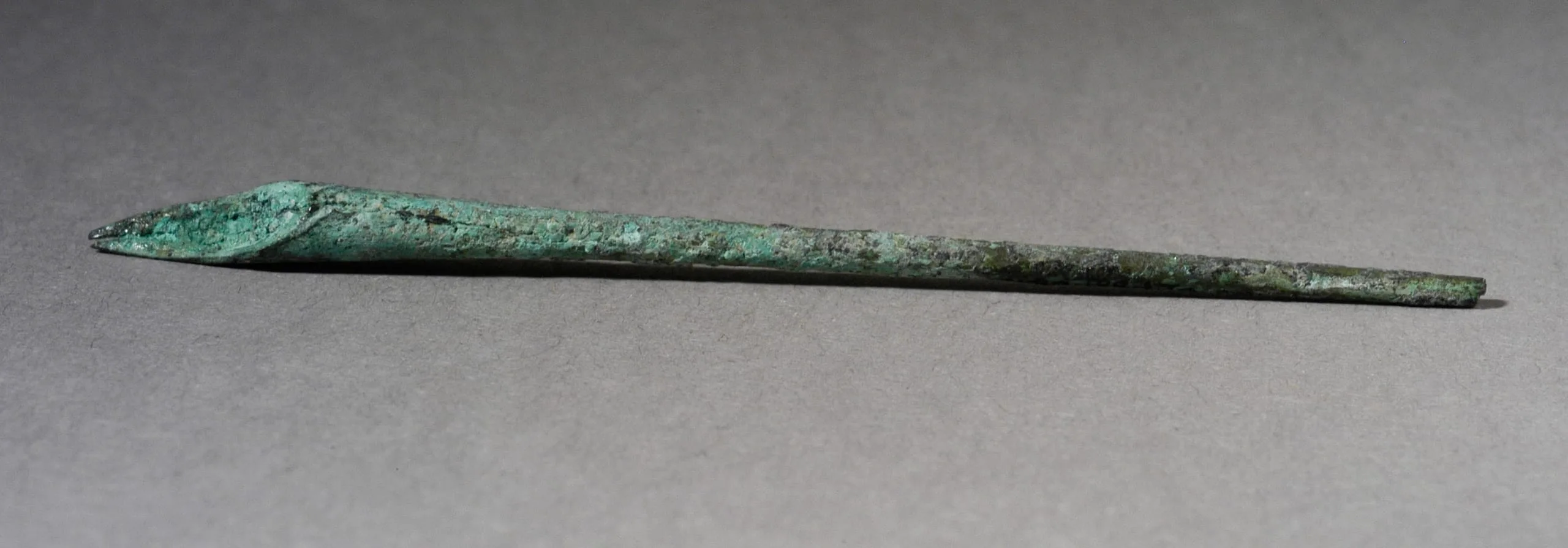 Bronze pin or needle with heavy verdigris patina, tapering to a sharp point, displayed diagonally against a gray background
