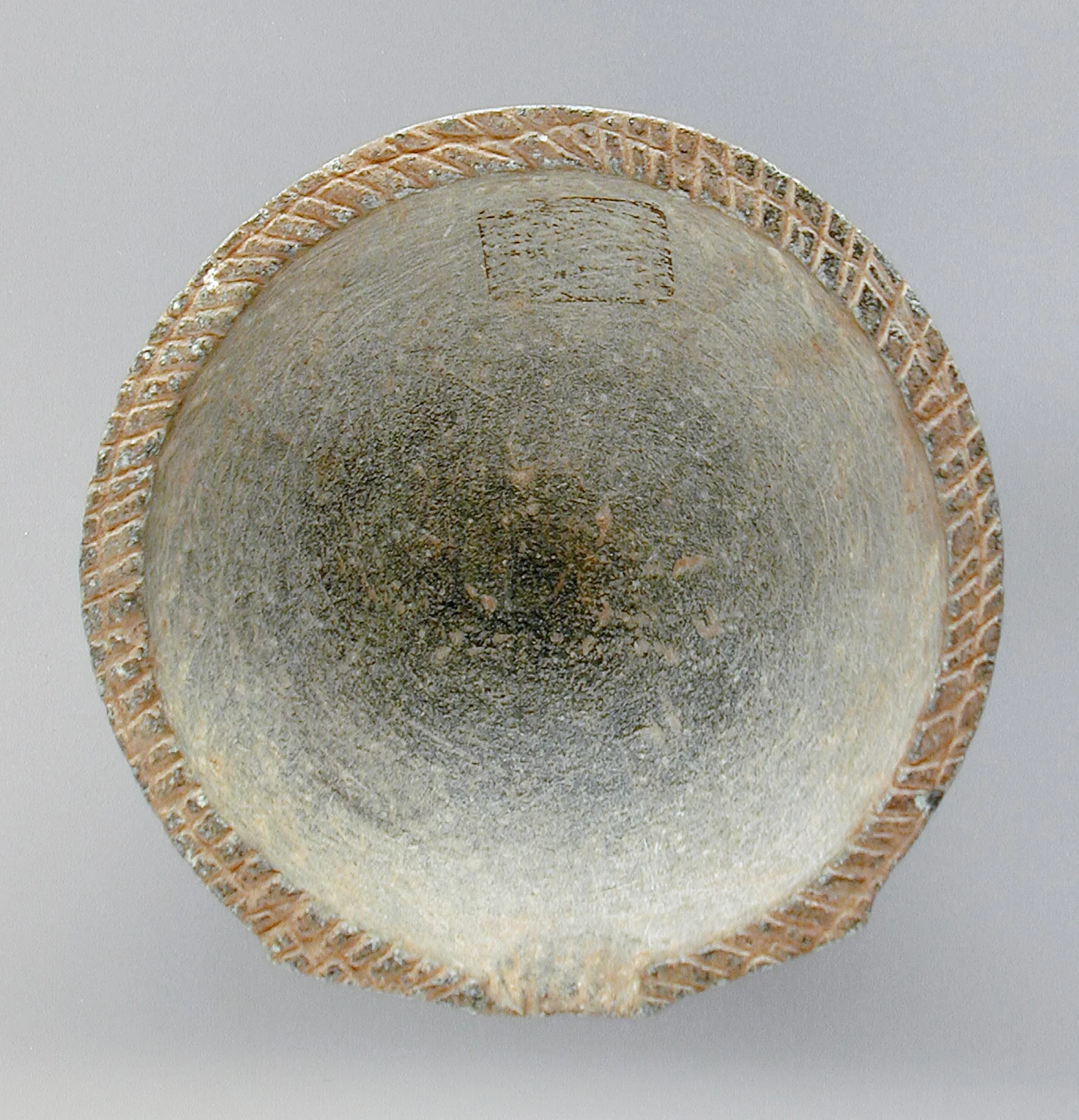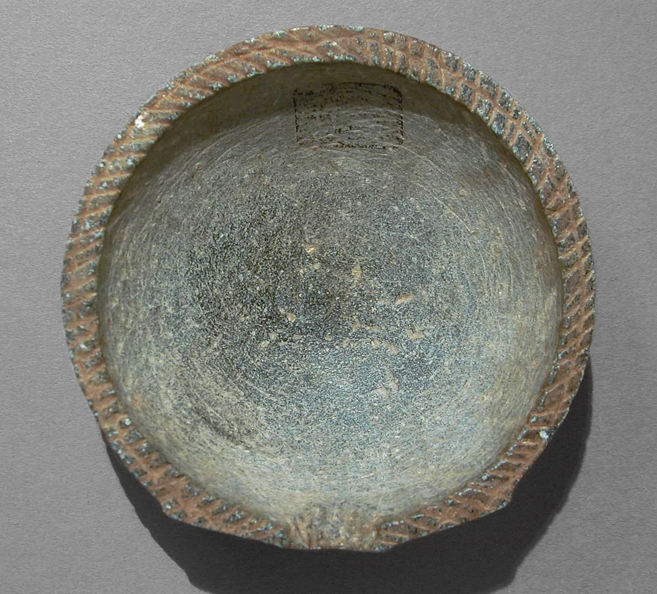 Ceramic bowl seen from above, with a mottled ash-gray and olive-green glazed interior, wide unglazed rim with incised chevron pattern, and a small impressed cartouche near the top