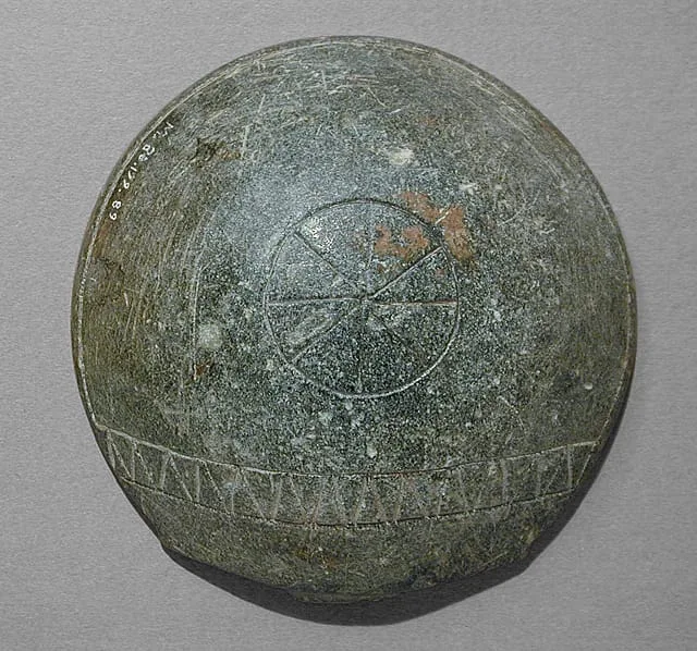 Bronze disc with green patina, domed form, featuring an incised spoked wheel motif at center and a band of Latin inscription along the lower edge, with surface scratches throughout.