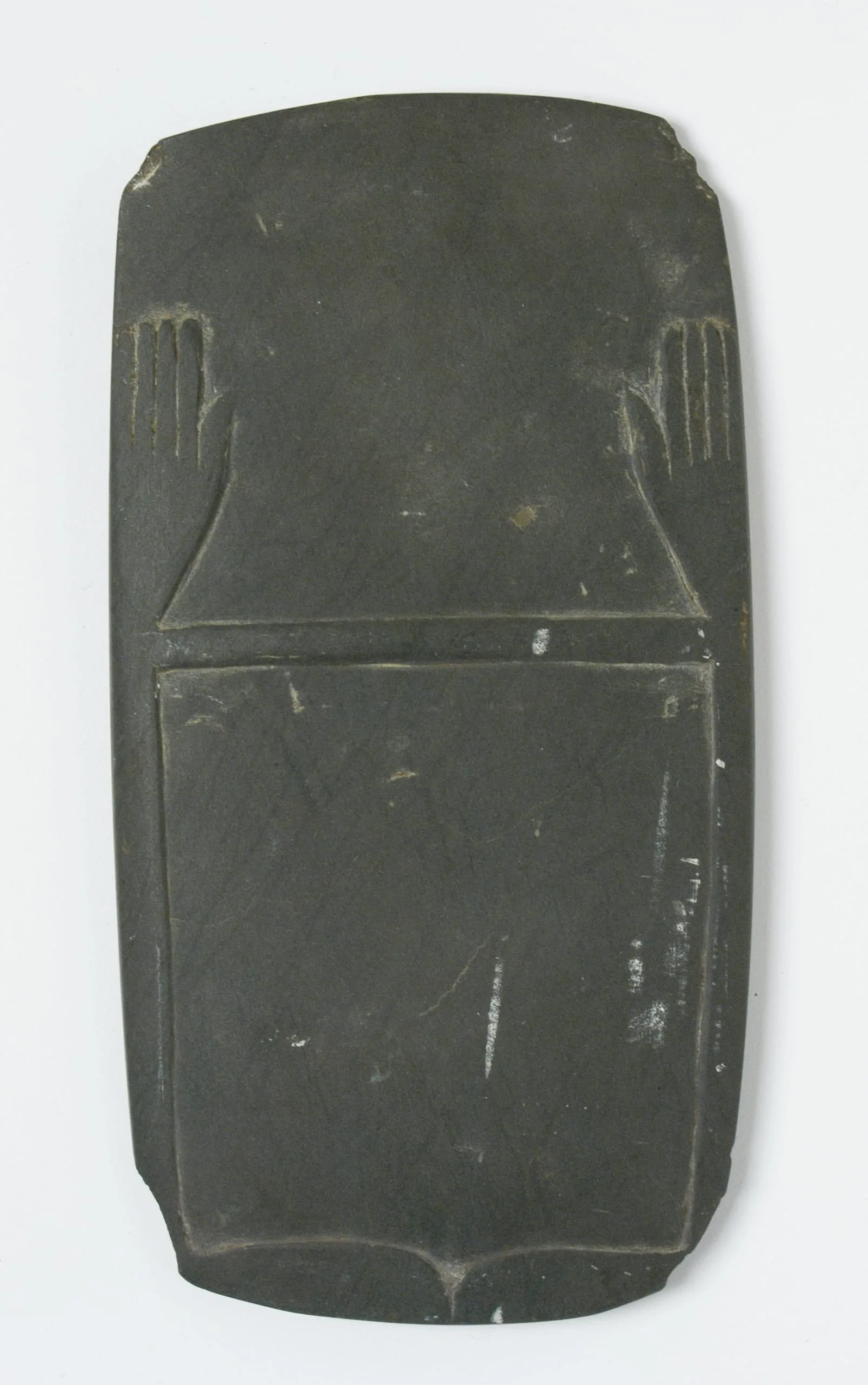 Dark gray-green stone palette, flat and rectangular with rounded corners, carved in low relief with two stylized hands at the top and a recessed rectangular panel below