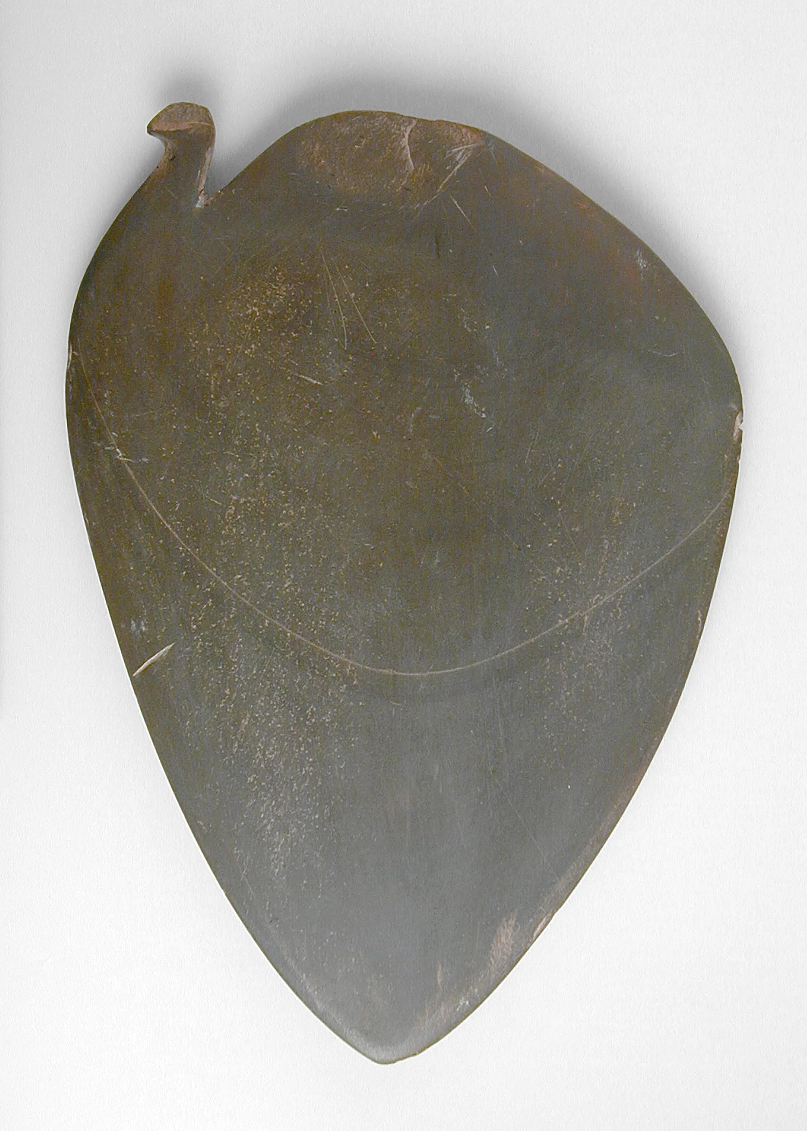 Flat, shield-shaped stone palette in dark gray-green, with a small hooked tab at the upper left and a scratched, worn surface