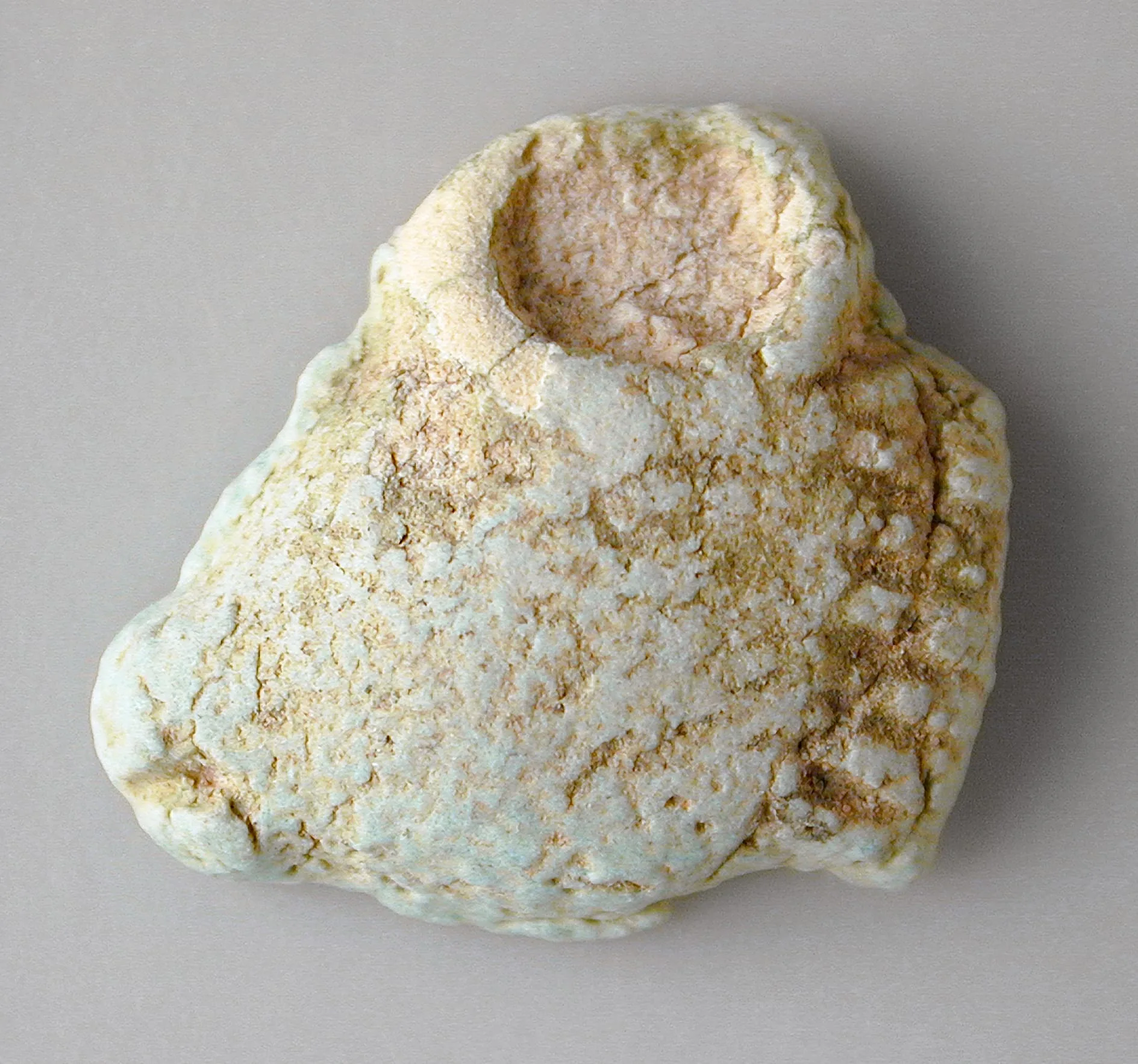 Small sculptural object with chalky white and sage green encrusted surface, irregular form with a shallow circular cup-like opening at the top