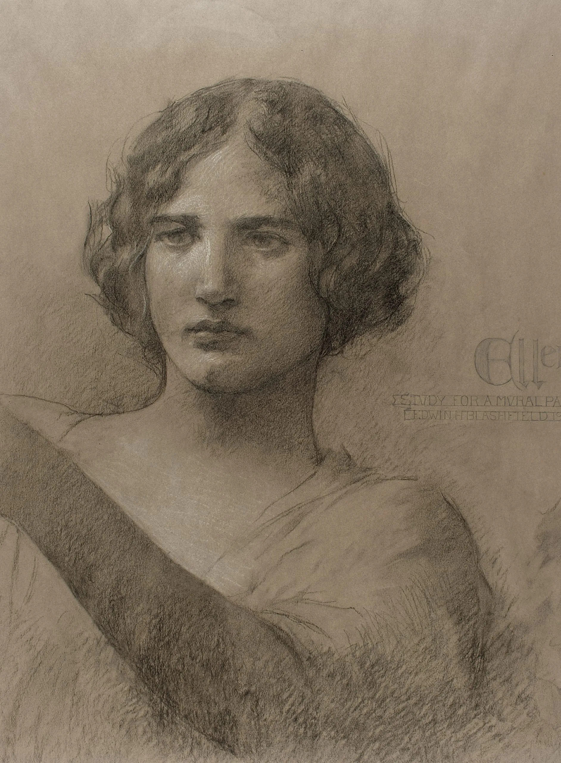 - Charcoal with white chalk, graphite, on gray charcoal paper