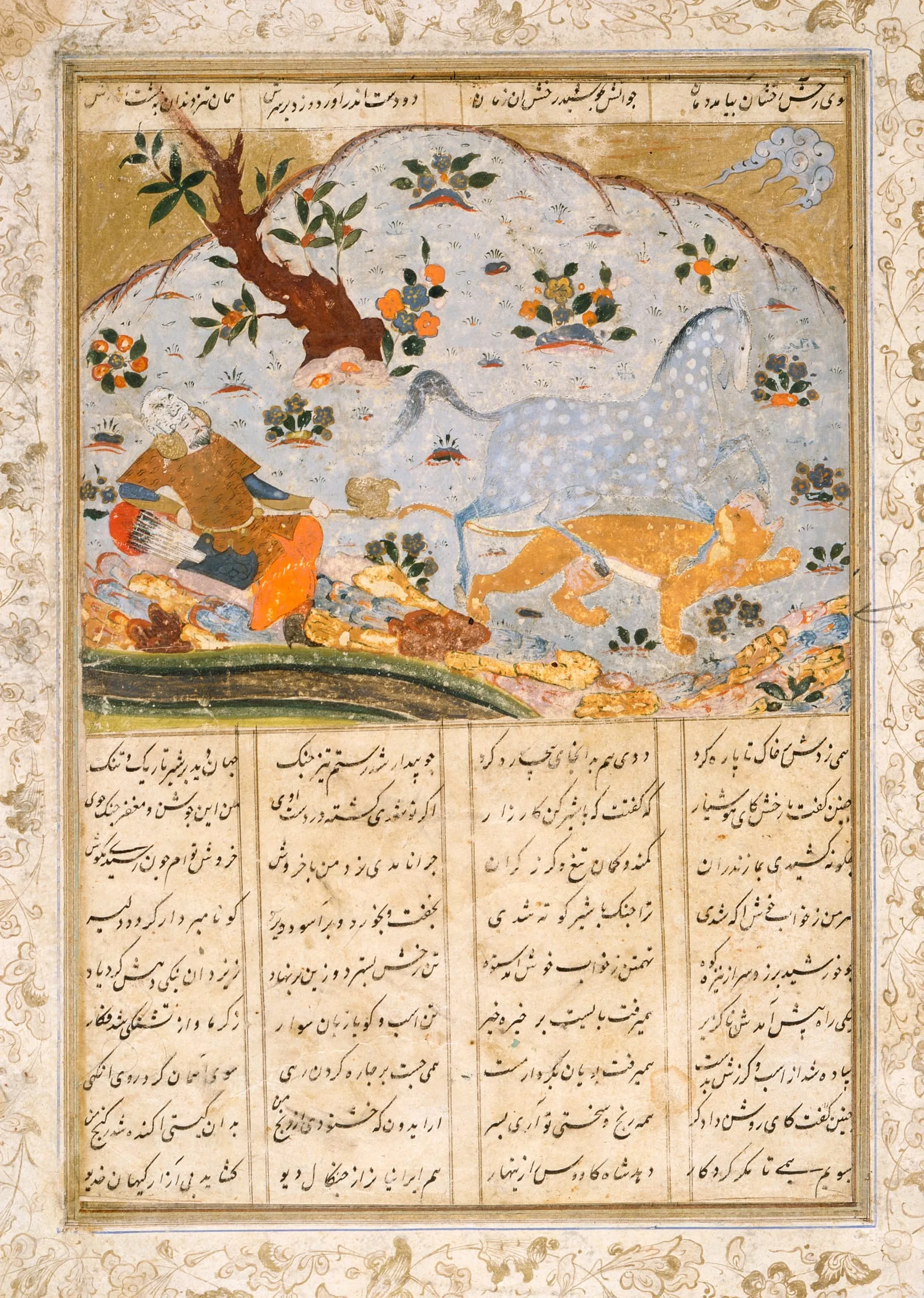 In the illustration, the hero Rustam is asleep on some rocks beside a stream. He wears a white leopard head-helmet, tiger skin-jacket, and orange trousers. He has a quiver of arrows suspended from his belt and holds an ox-headed mace (gorz). Rustam is accompanied by his faithful steed, Rakhsh (Lightning or Luminous), a mighty colt who is described in the text as rose-colored but envisioned here as spotted gray. Rakhsh is trampling an attacking lion (portrayed in the Persianate convention without a full mane), which had planned to devour him and then his dozing master Rustam. The light gray landscape is festooned with clumps of daisy-like flowering plants and a gnarled old tree. The rocks on which Rustam slumbers are multihued and abstract in formation. The folio was later remounted with an outer border decorated with gold scrolling vines. The verso is a page of text in nastaliq script.