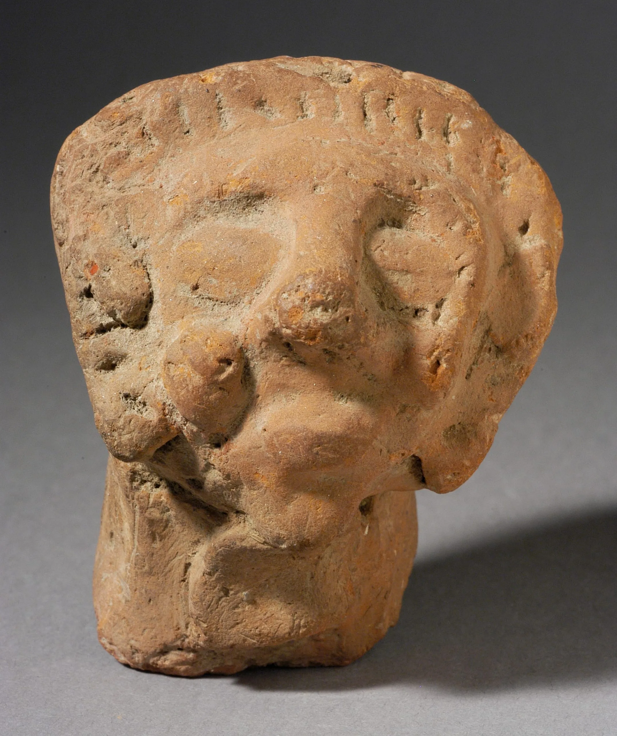 Small terracotta sculpture of a human head with bulging eyes, flat nose, and incised lines along the top and sides suggesting stylized hair or a wreath; rough, pitted surface with gray-green mineral deposits