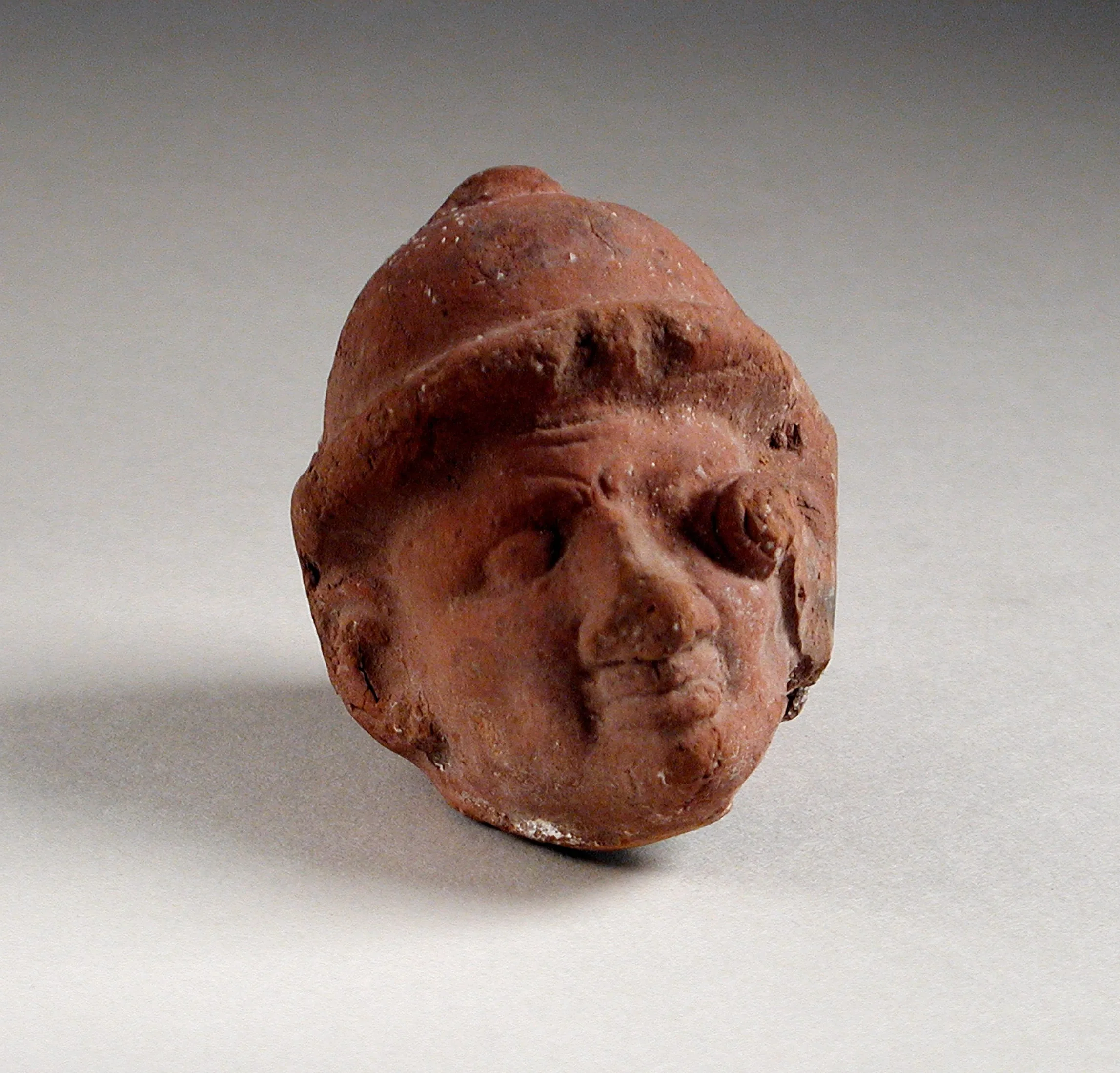 Small ancient terracotta head fragment, brick-red clay with worn surface, depicting a figure wearing a low rounded cap, with fleshy facial features