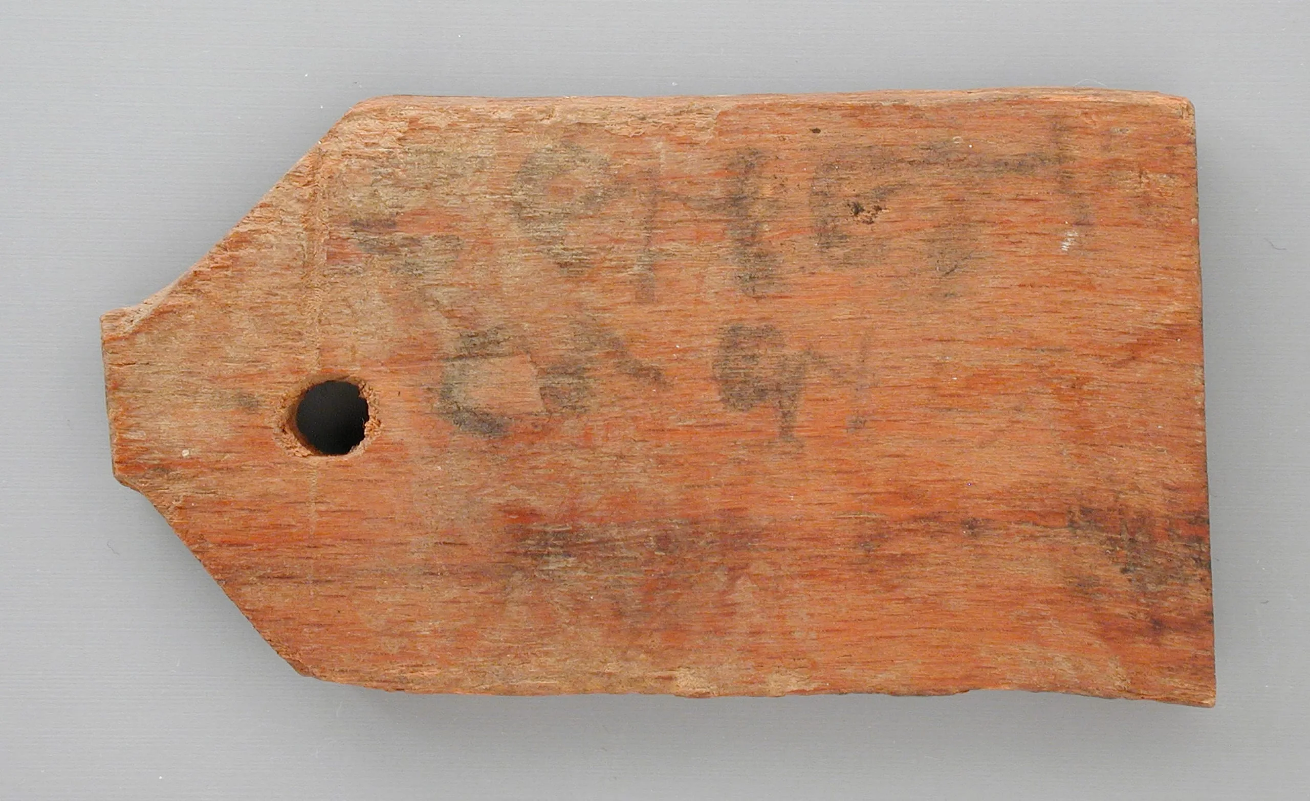 Worn wooden tag with a pointed left end and circular hole, bearing faint hand-inscribed characters across the surface