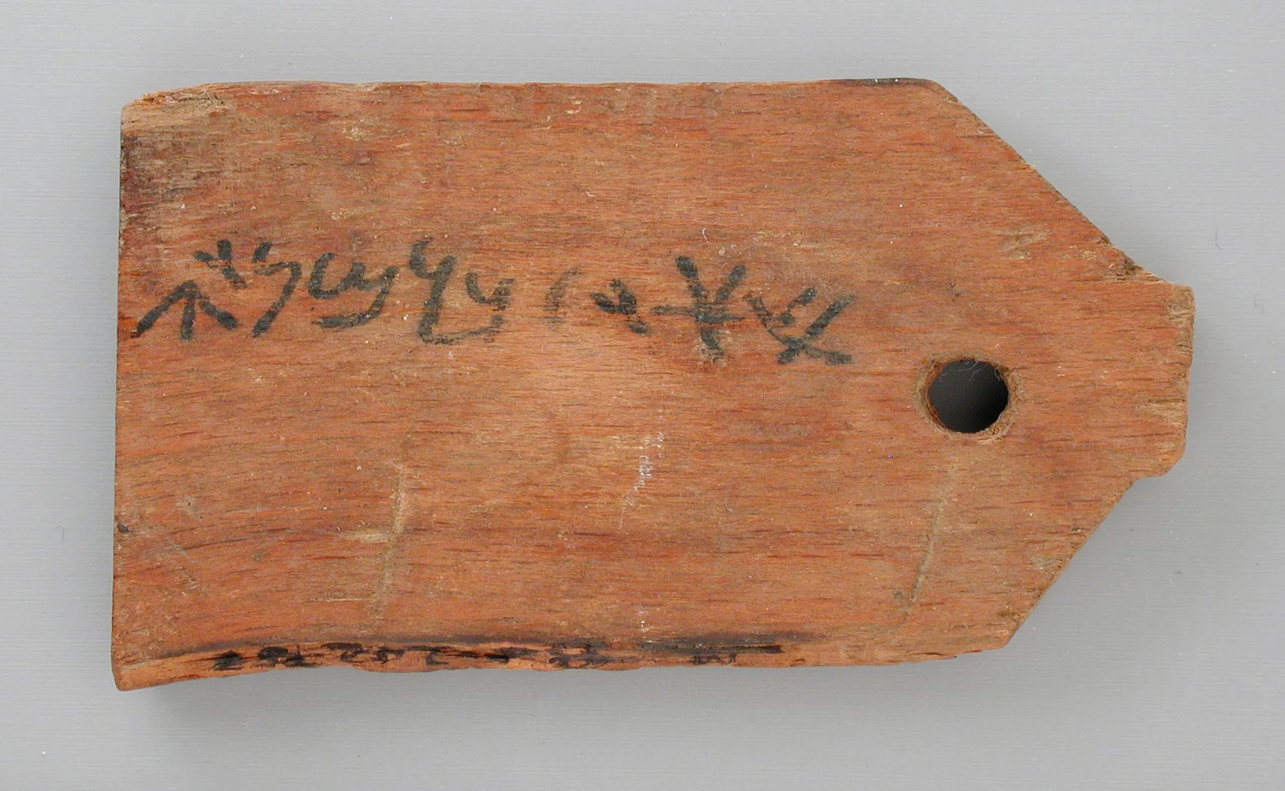 Rectangular wooden tag with pointed left end and a circular hole at right, reddish-brown surface inscribed with a single line of ancient Semitic script in dark ink.