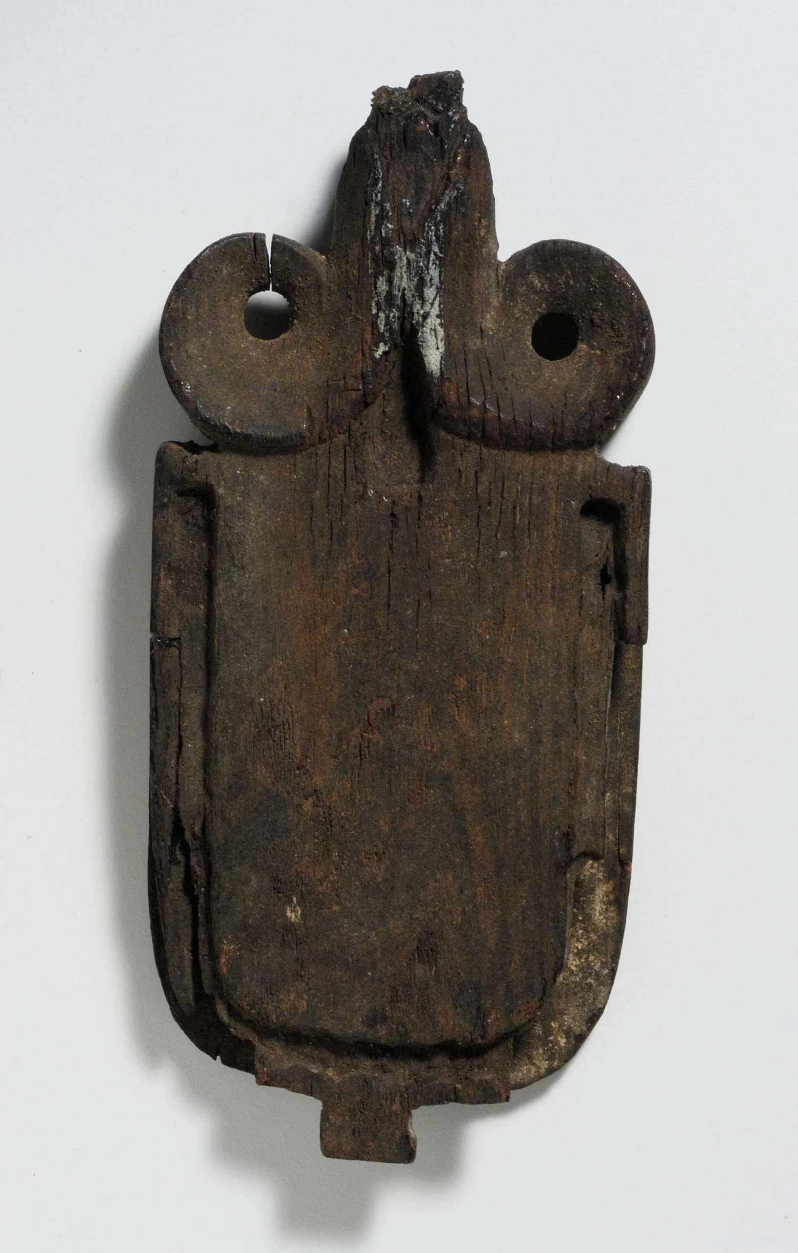 Carved wooden object with a shield-shaped body, two disk-like projections with holes flanking a central post, and a small tab at the base; heavily worn dark brown surface