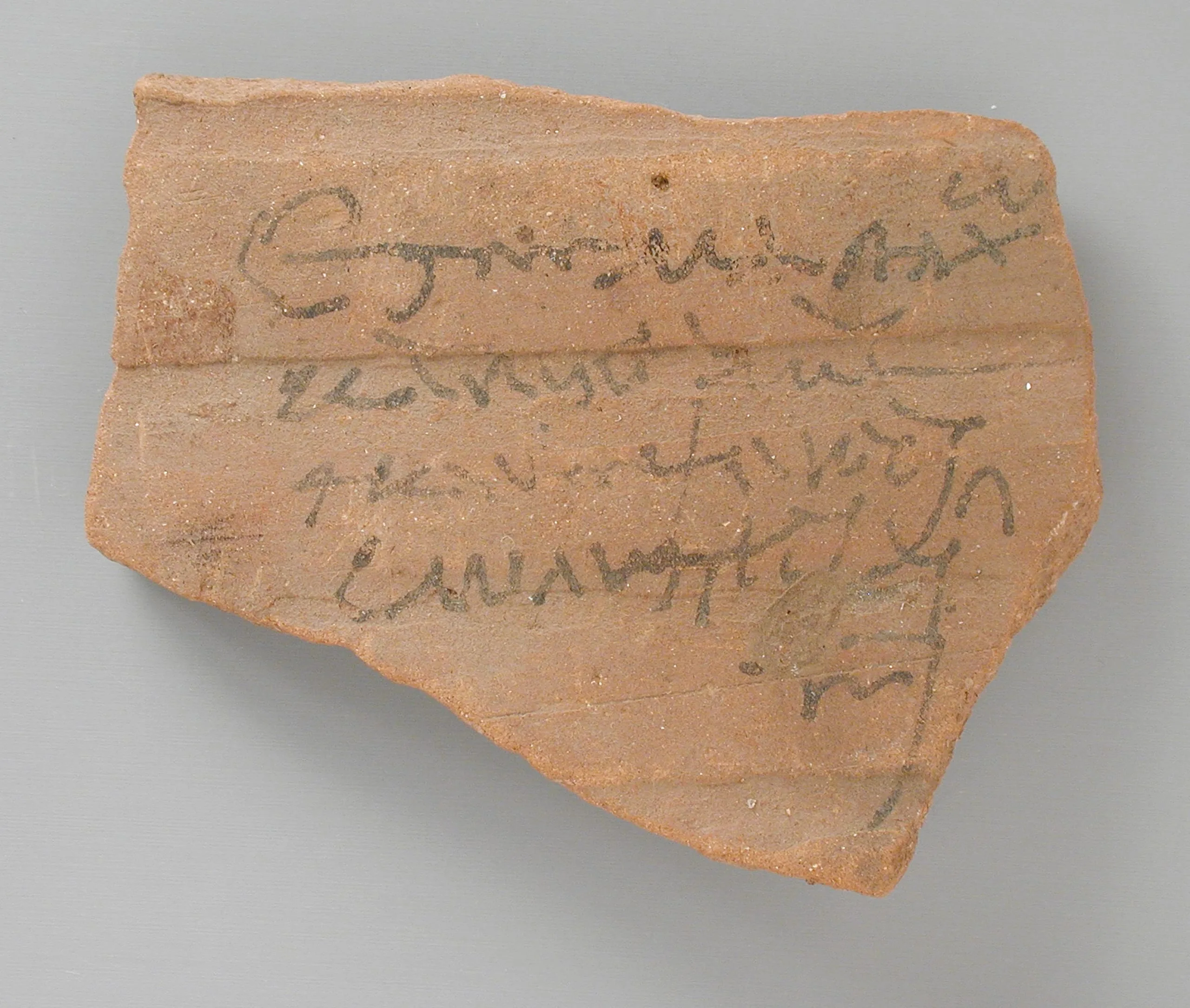 Terracotta pottery shard with five lines of cursive Coptic or Greek script written in dark gray ink on an unglazed salmon-pink surface