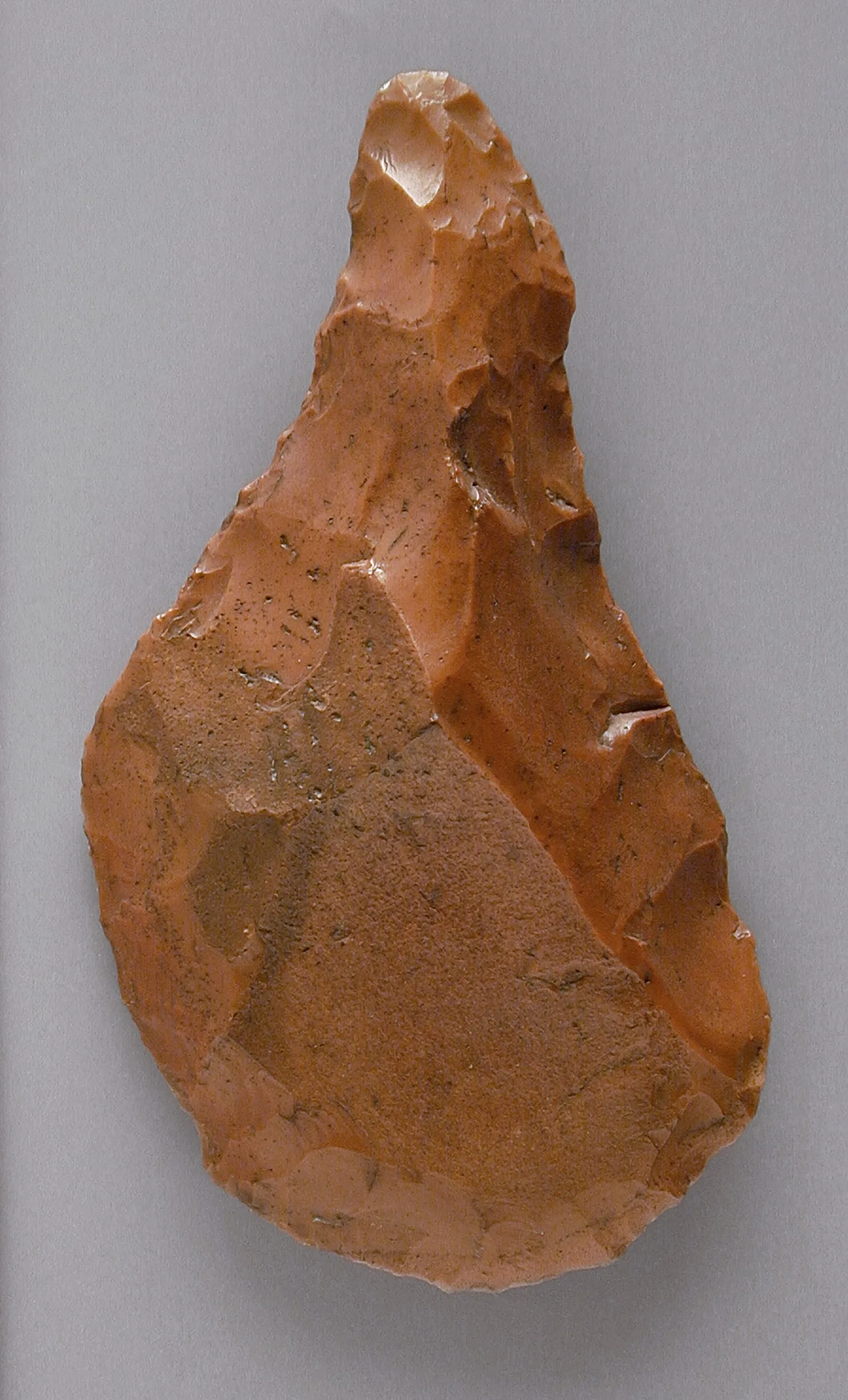 Teardrop-shaped prehistoric flint handaxe in burnt-orange and tan stone, with flaked edges and a central patch of unworked cortex, displayed against a gray background