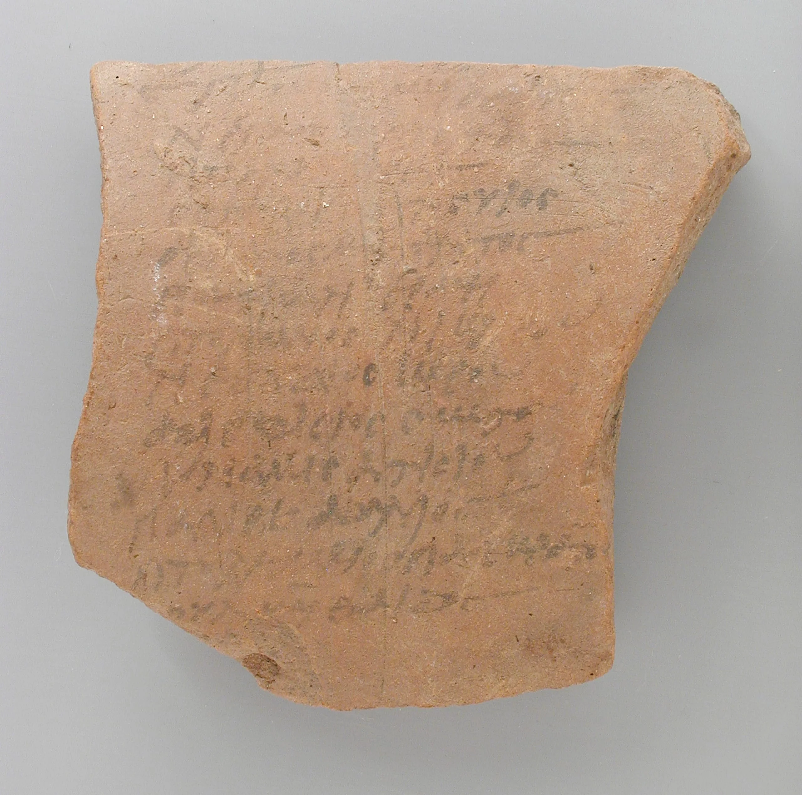 Unglazed terra-cotta ceramic shard with multiple lines of handwritten cursive script in dark ink, possibly Greek or Coptic