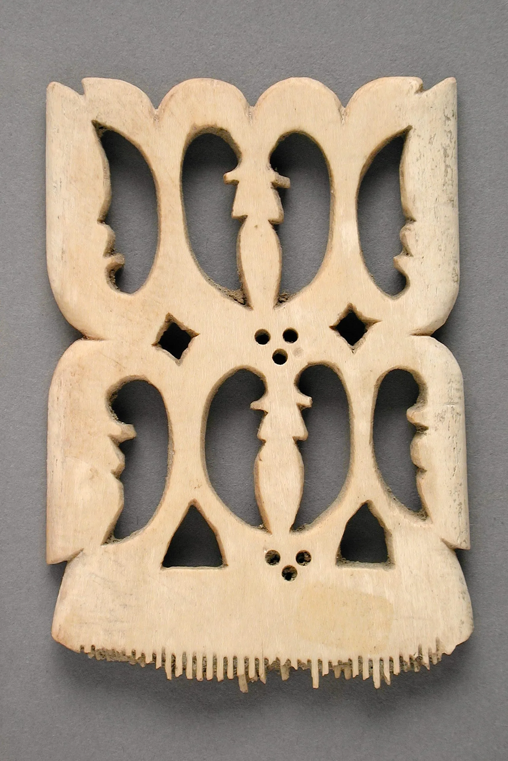 Ivory or bone comb with an ornate pierced upper panel featuring symmetrical oval openings, a central leaf motif, diamond and round cutouts, and fine teeth along the bottom edge