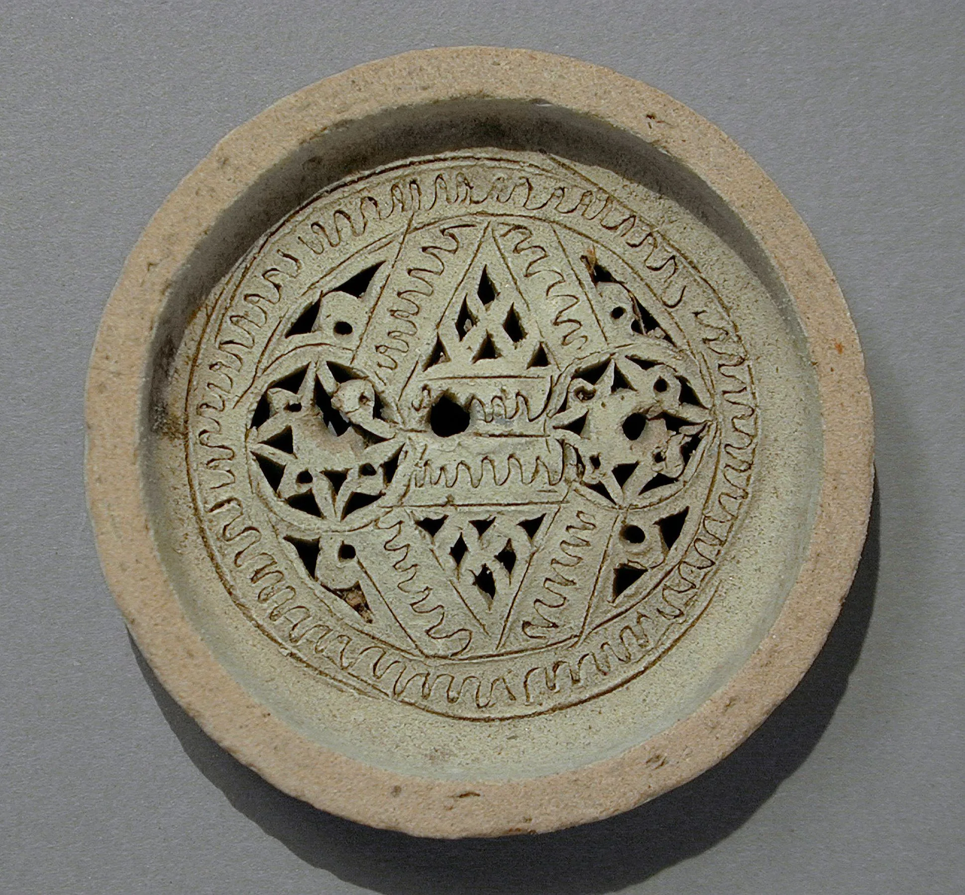 Circular ceramic lid or disk with pale celadon glaze, featuring openwork pierced geometric and floral decoration arranged in concentric bands around a central star form