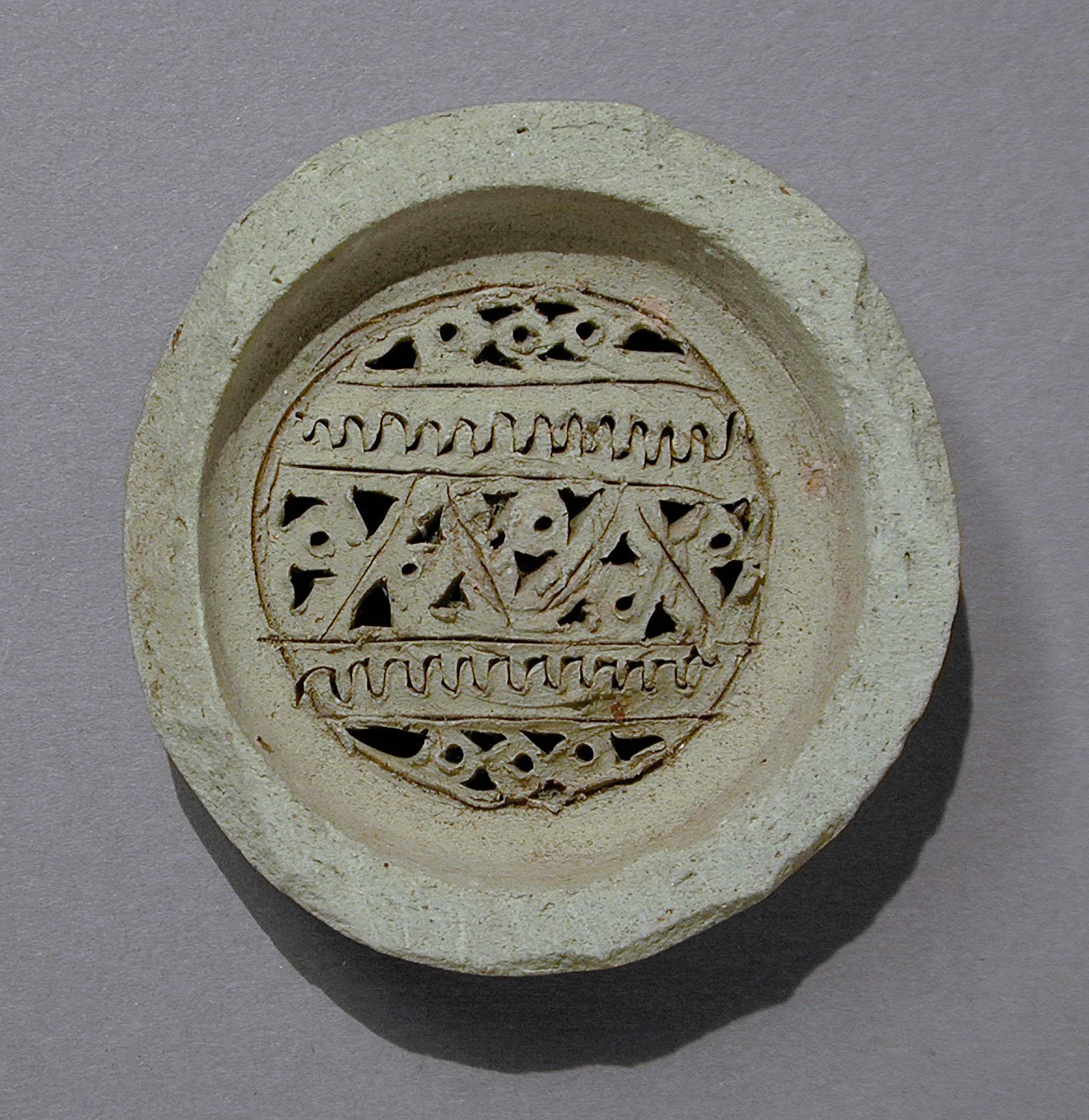 Small circular ceramic dish with a wide flat rim and a pierced openwork disc interior, decorated with wave borders and a diagonal lattice band, in cream-colored ceramic with rust-brown residue in the carved lines